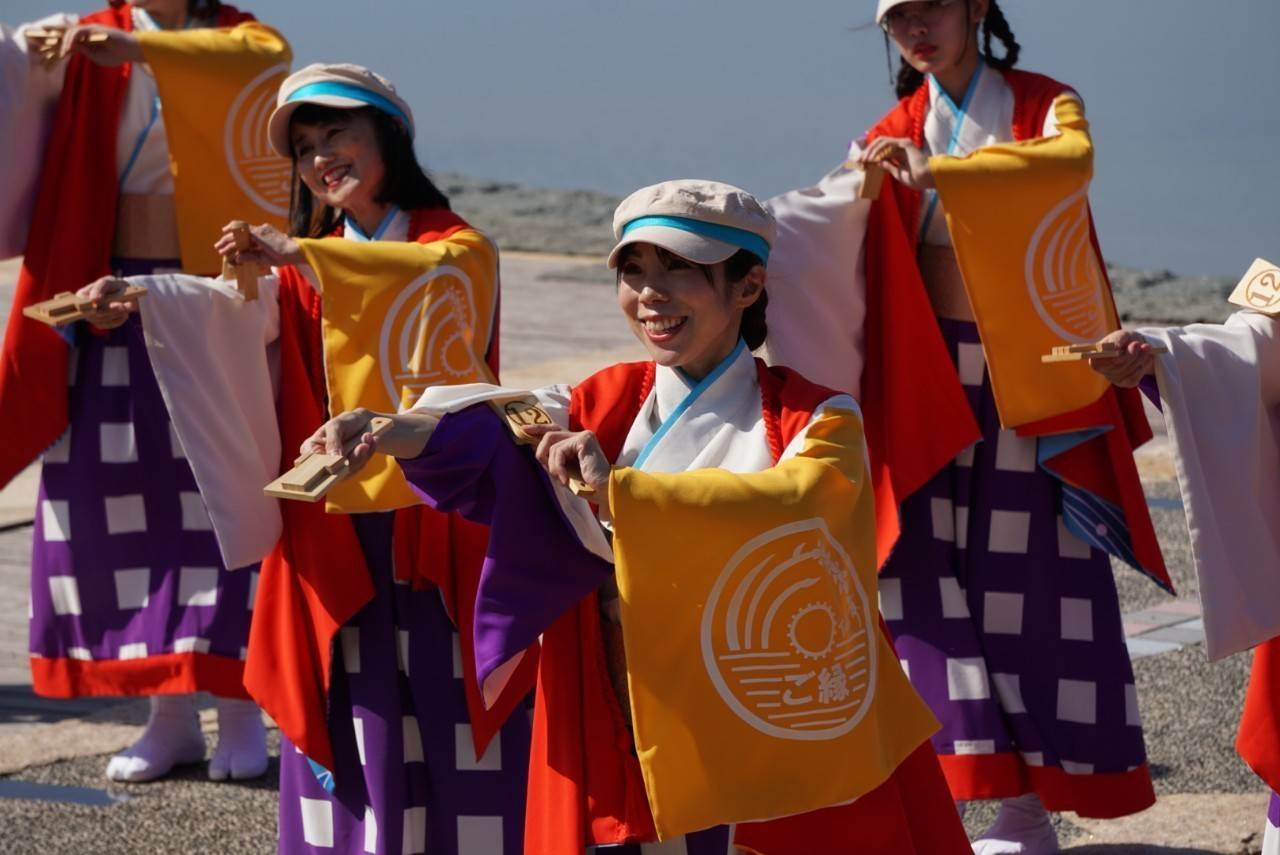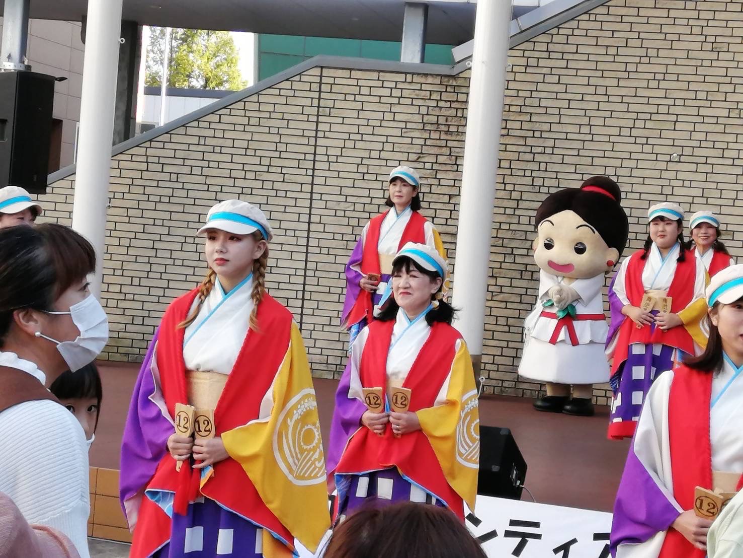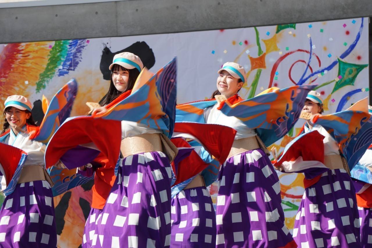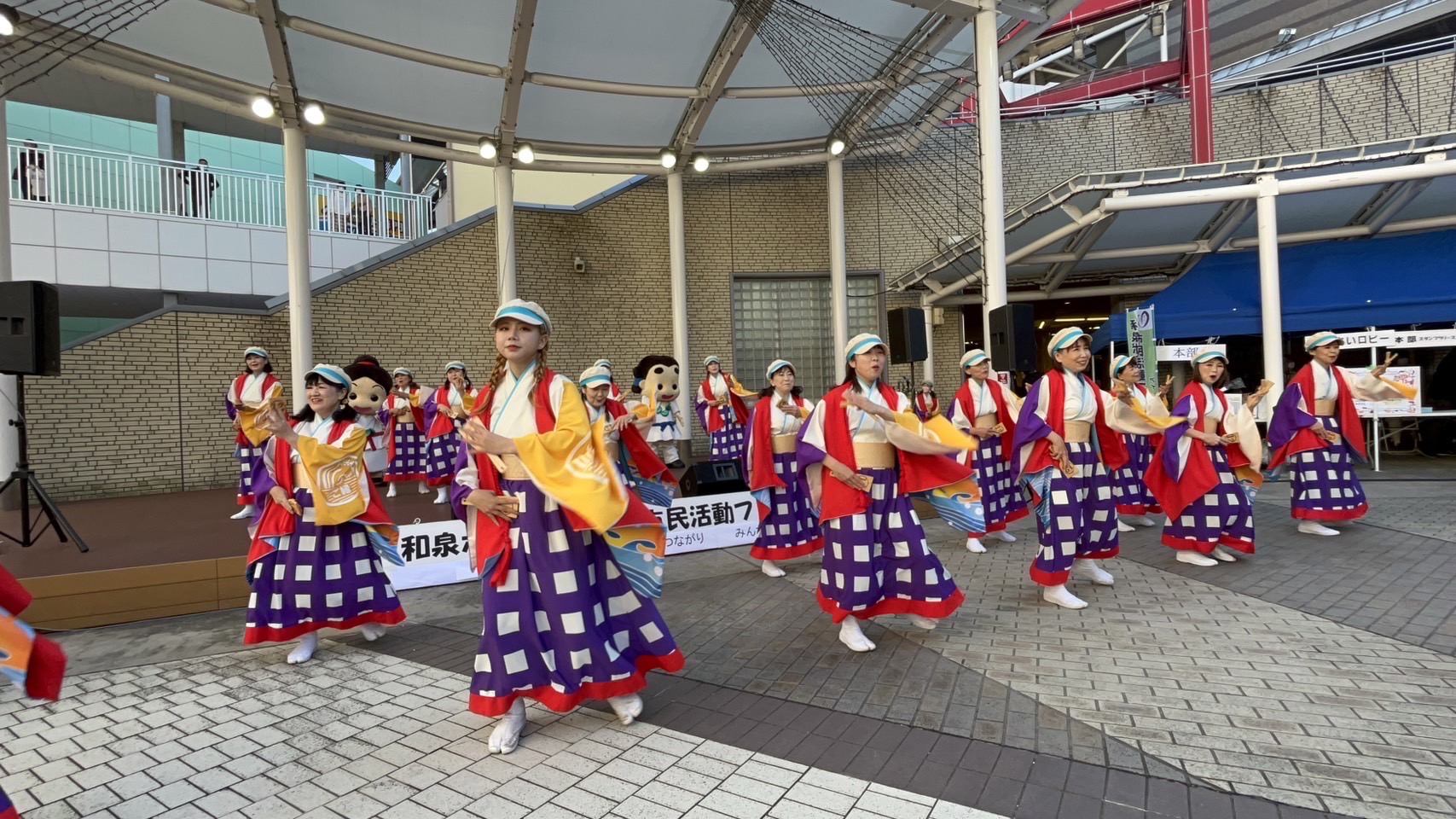 今回のイベントではステージのトリをつとめさせていただきましたが、同時に「ご縁」を地元の皆さんに見ていただける初めての機会でもあり、大きな声援をいただきました。ラストは桃山学院大学の真輝さんや、和泉市のゆるキャラ「コダイくんとロマンちゃん」と一緒に「正調よさこい鳴子踊り」で会場を盛り上げました。