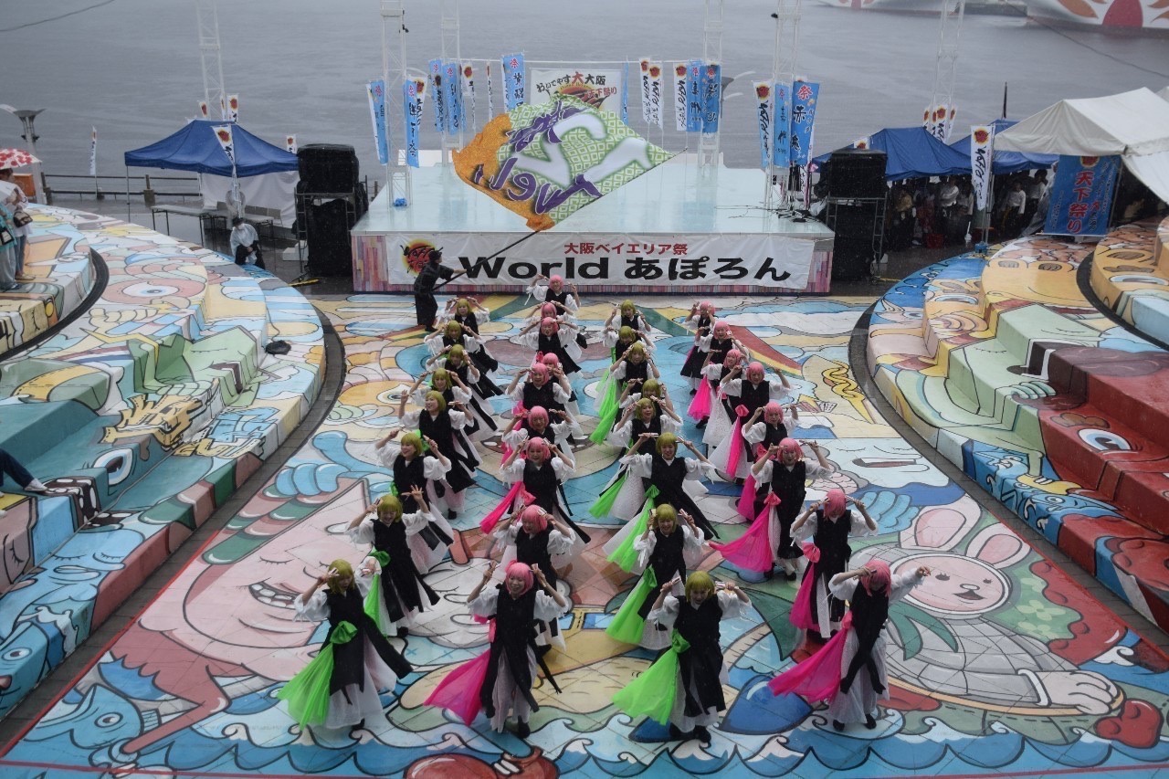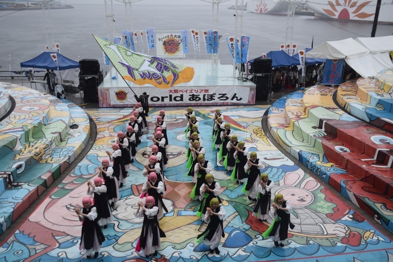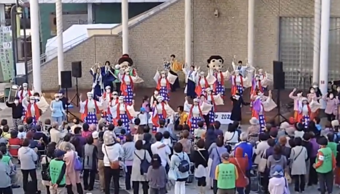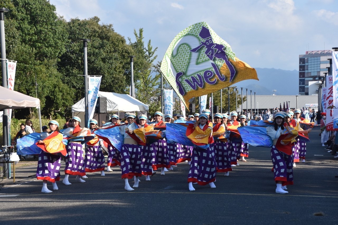 今回のイベントではステージのトリをつとめさせていただきましたが、同時に「ご縁」を地元の皆さんに見ていただける初めての機会でもあり、大きな声援をいただきました。ラストは桃山学院大学の真輝さんや、和泉市のゆるキャラ「コダイくんとロマンちゃん」と一緒に「正調よさこい鳴子踊り」で会場を盛り上げました。