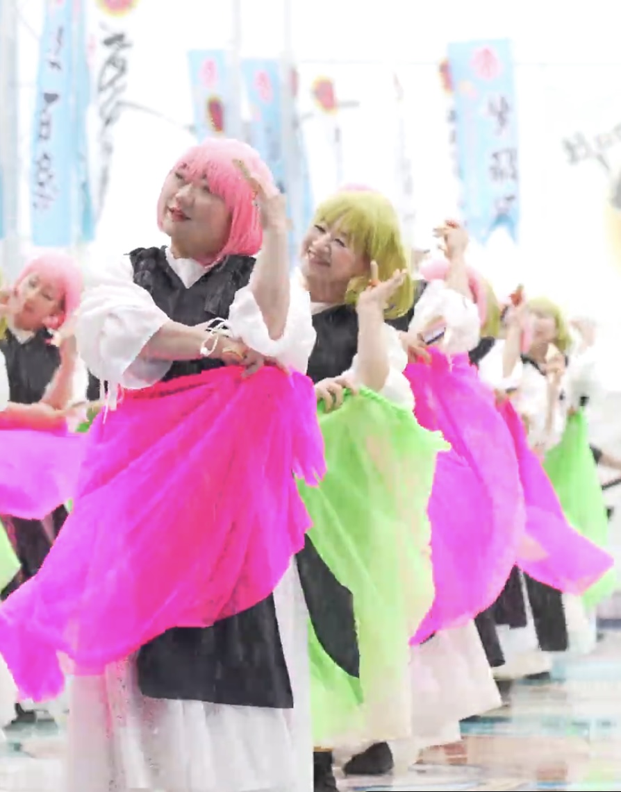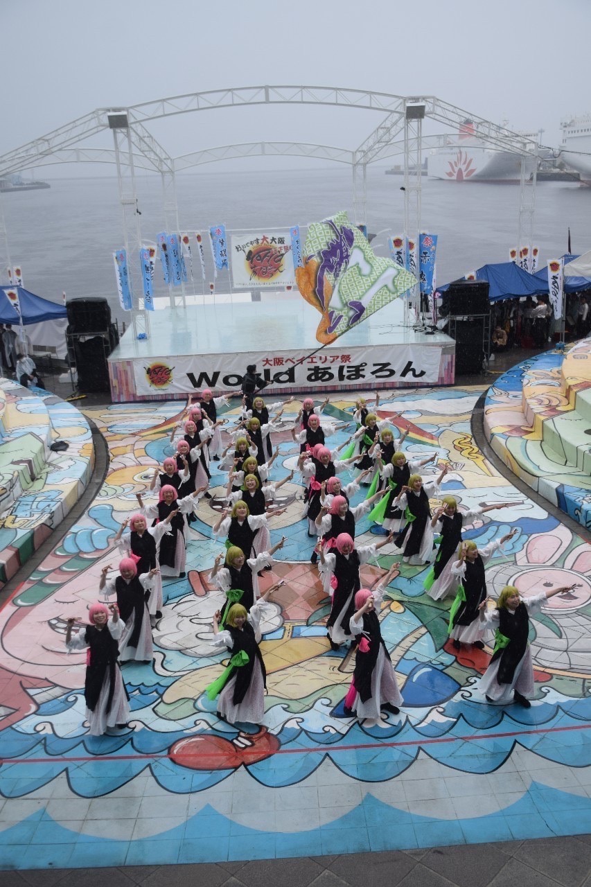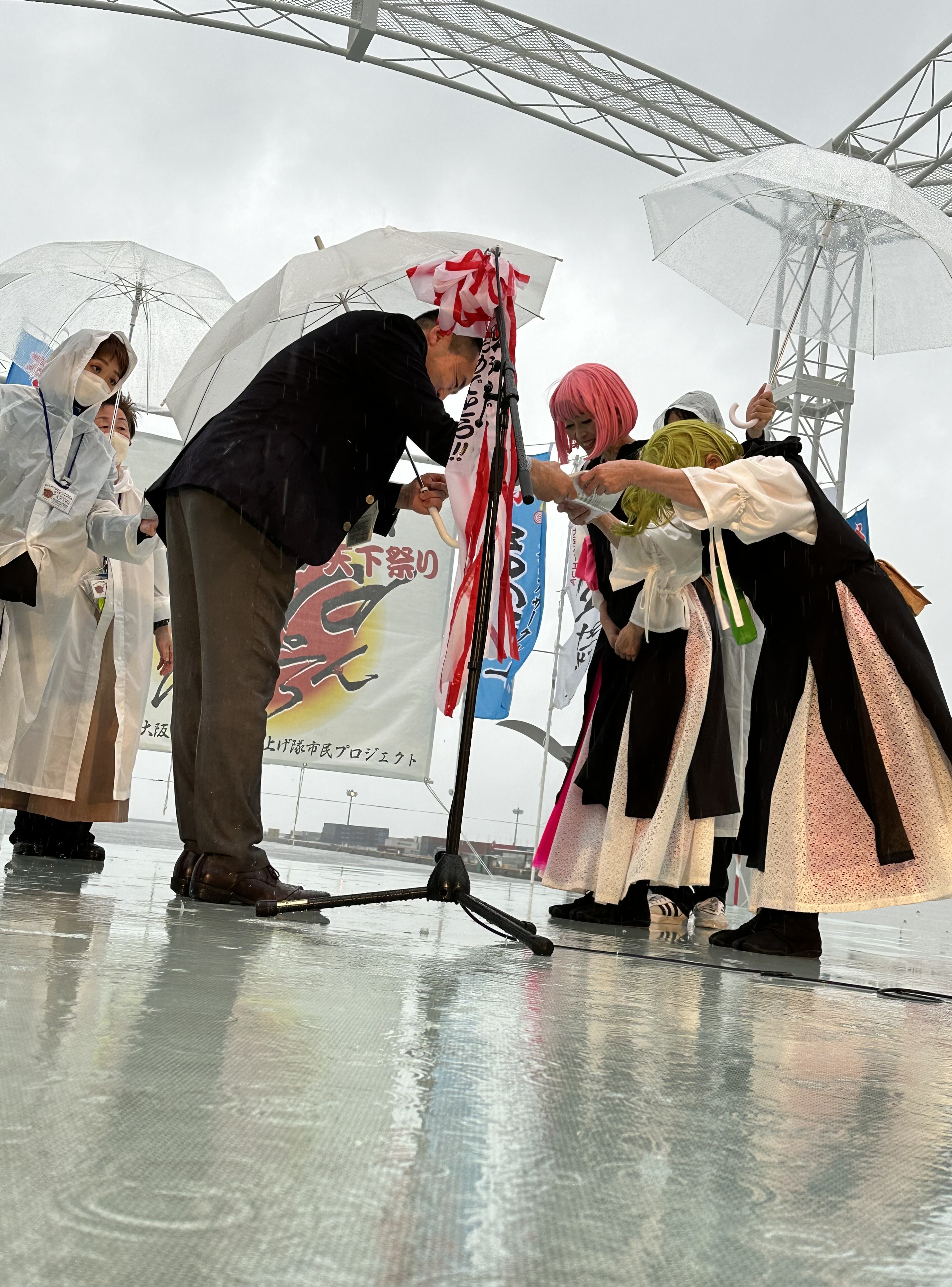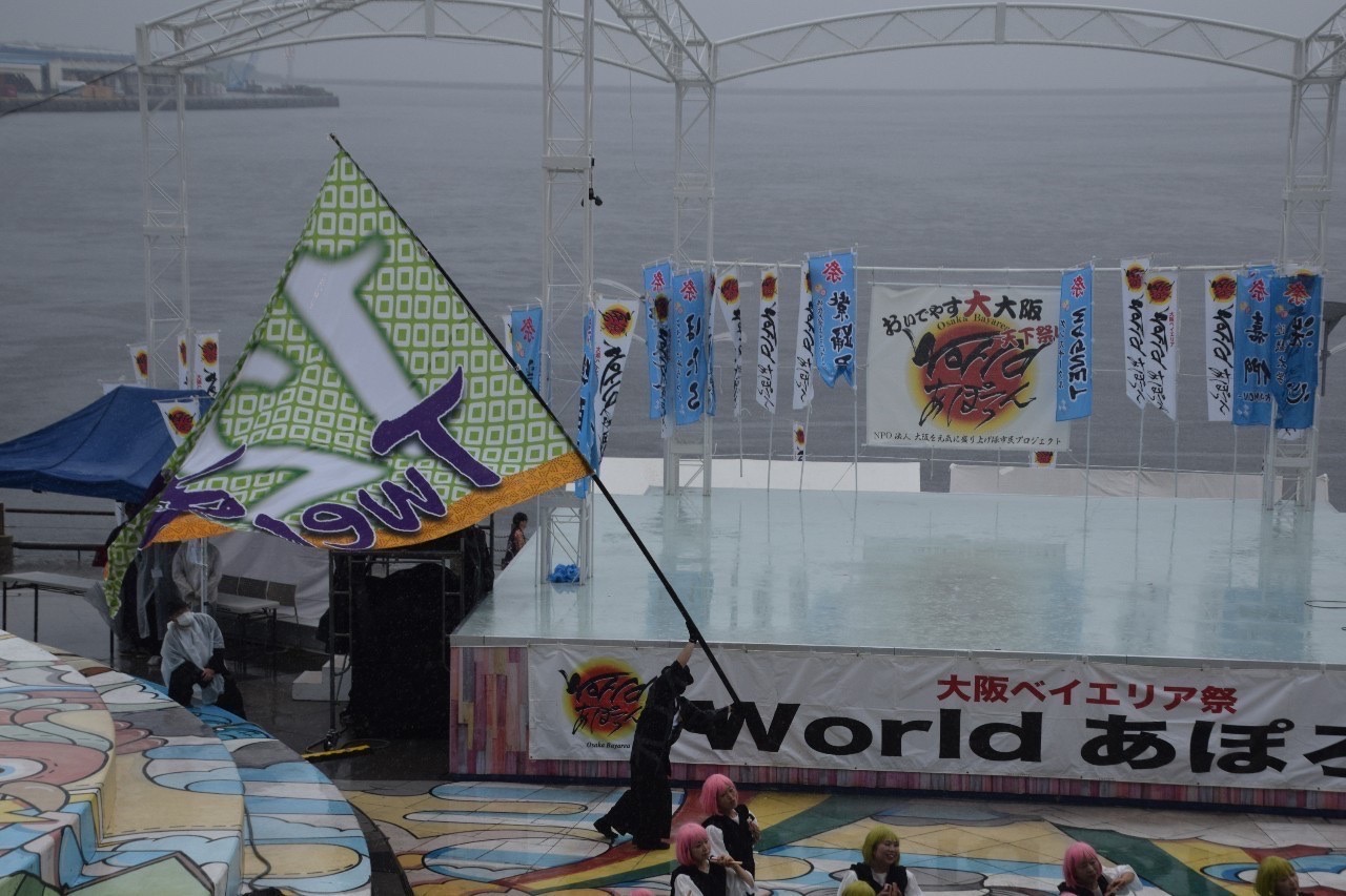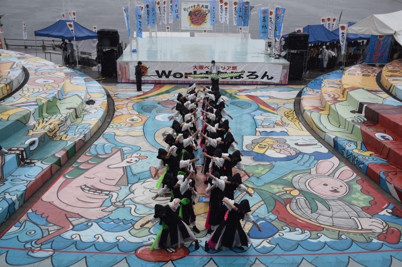 大旗から飛ぶ水しぶき。びしょ濡れでも笑顔の踊り子たち。雨の中、一生懸命に撮影してくださるカメラマンの皆さん。