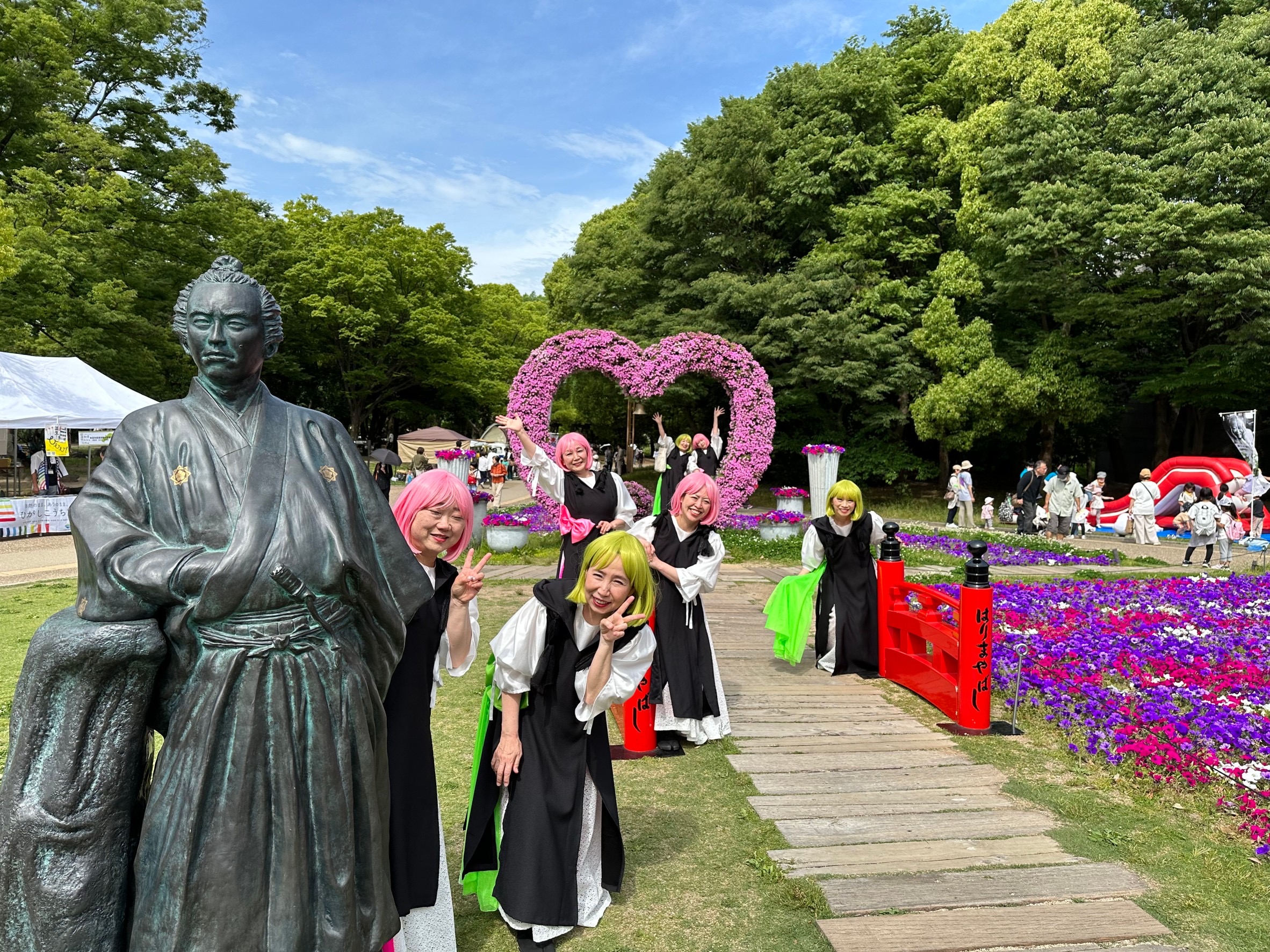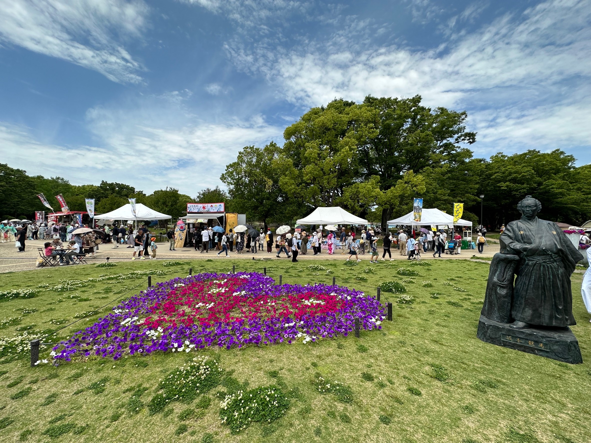 緑の中に高知県の宣伝ブースや各種キッチンカー(わ〜かつおのたたきもあるやん!)、お花畑の真ん中にはミニはりまや橋や坂本龍馬像まで出現。そしてカラフルなよさこいのいでたちの人がいっぱいです。