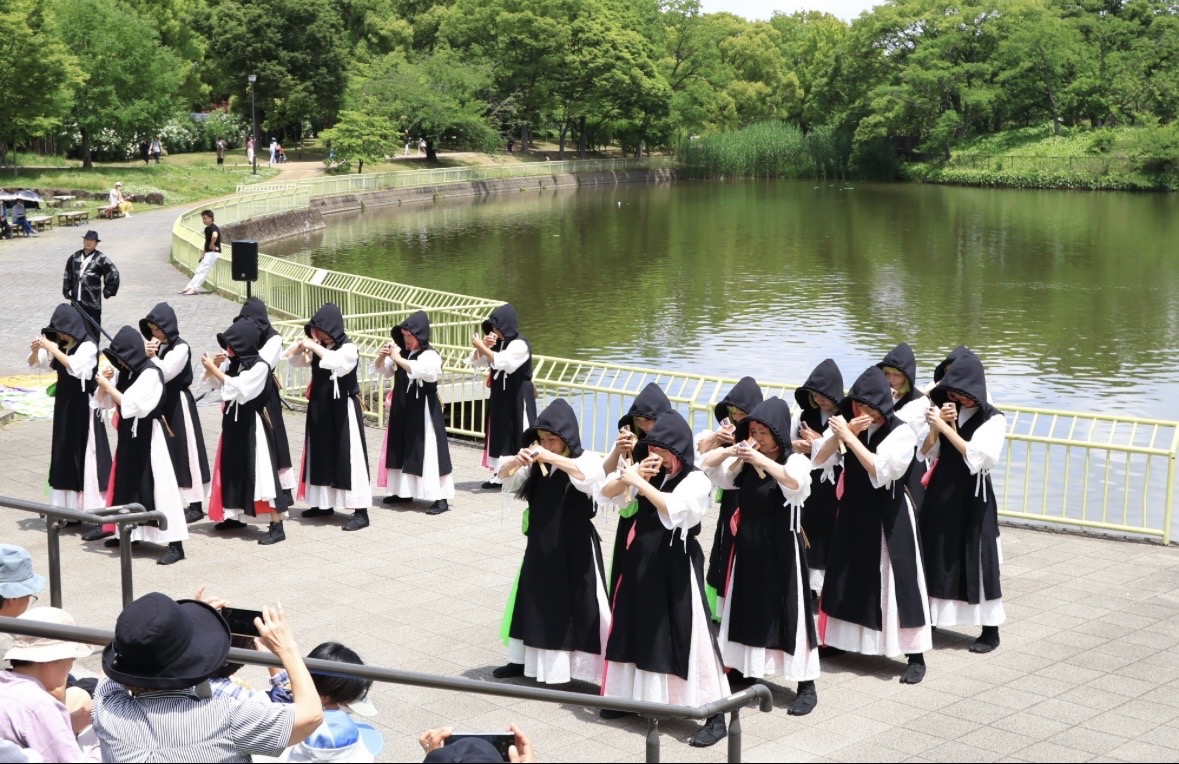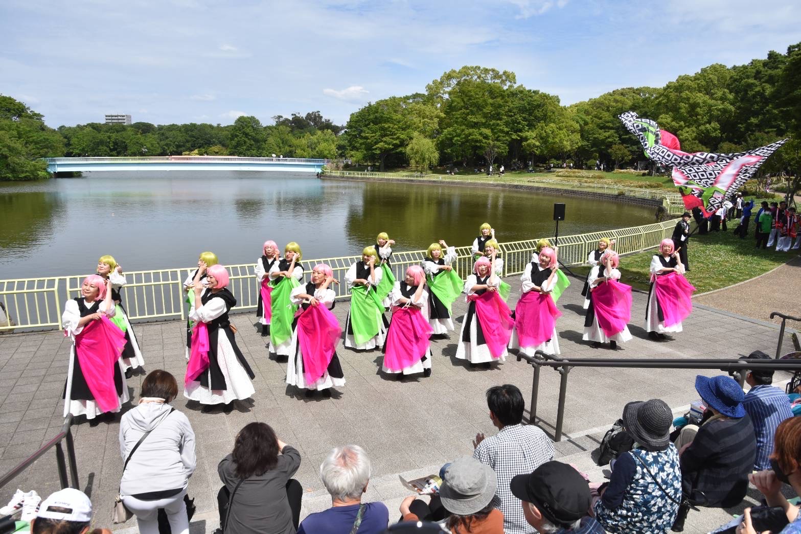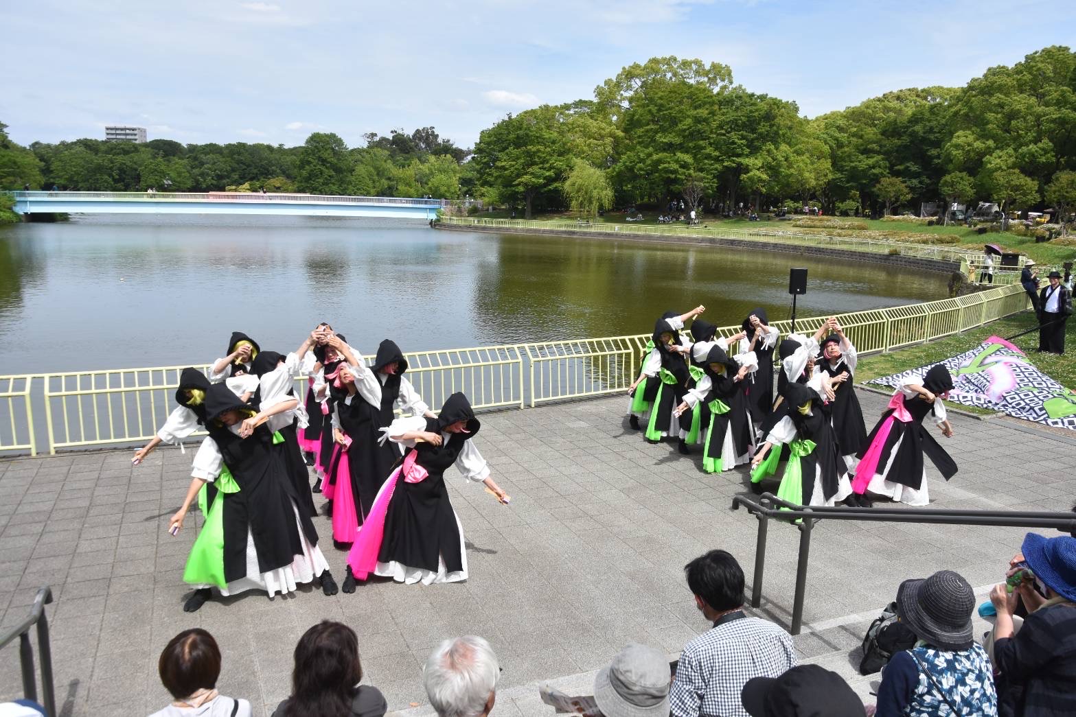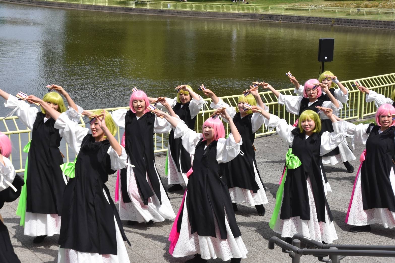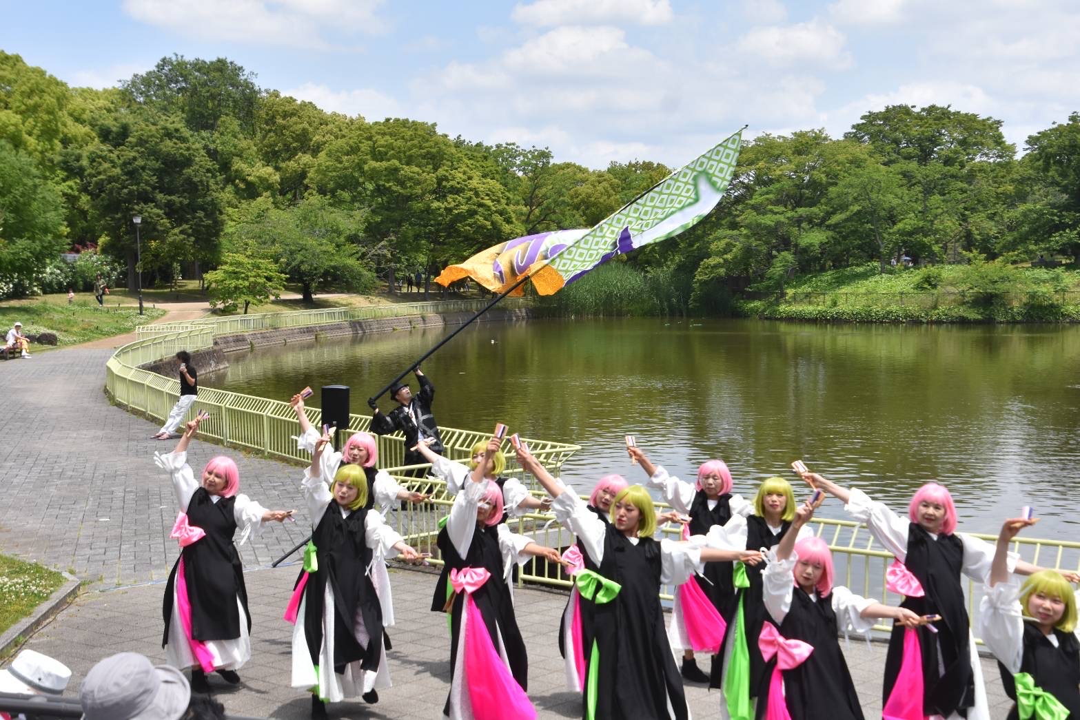 清々しい初夏の空気の中、池を背景に「ナチュラル」を2回踊らせていただきました。今回、チームの大旗を新調いたしましたので、緑いっぱいの中で旗をお披露目できて本当に良かったです。