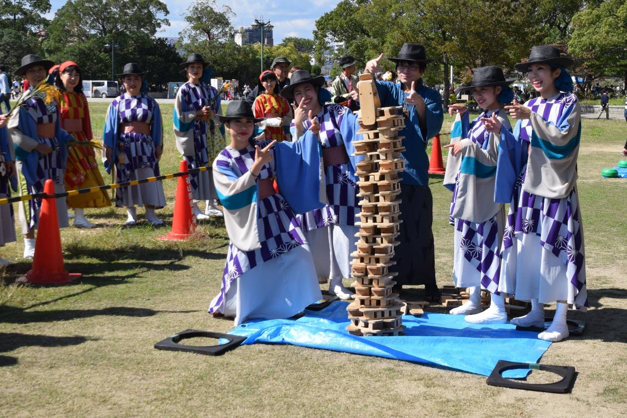 福山市名産の下駄を積み上げ、その高さを競う「ゲタリンピック」というチーム対抗のお楽しみ競技が今年もありました。若手5人が挑戦しましたが、惜しくも入賞ならず!