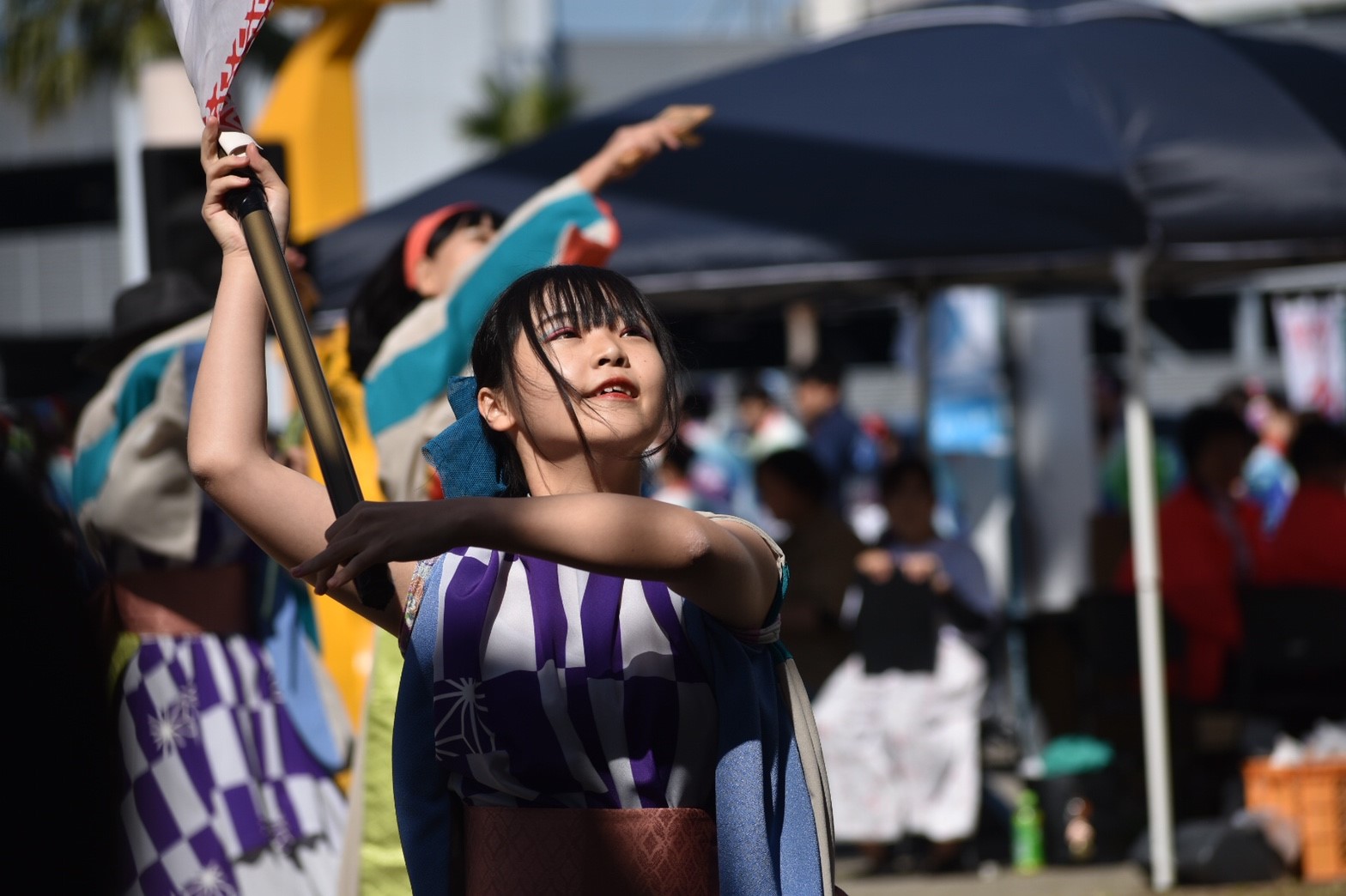 私たちはステージのトリとして、「ダイナミック琉球」と「神の宝の玉手箱」の2曲を踊らせていただきました。たくさんのお客さんが前にも横にもすぐ近くに!小さい子どもたちのかわいい声援も響いていました。
