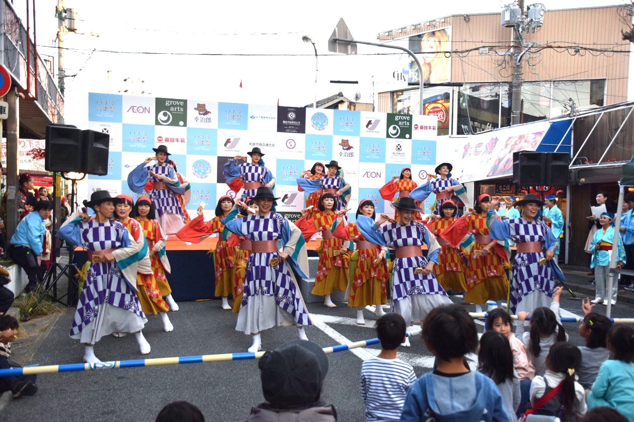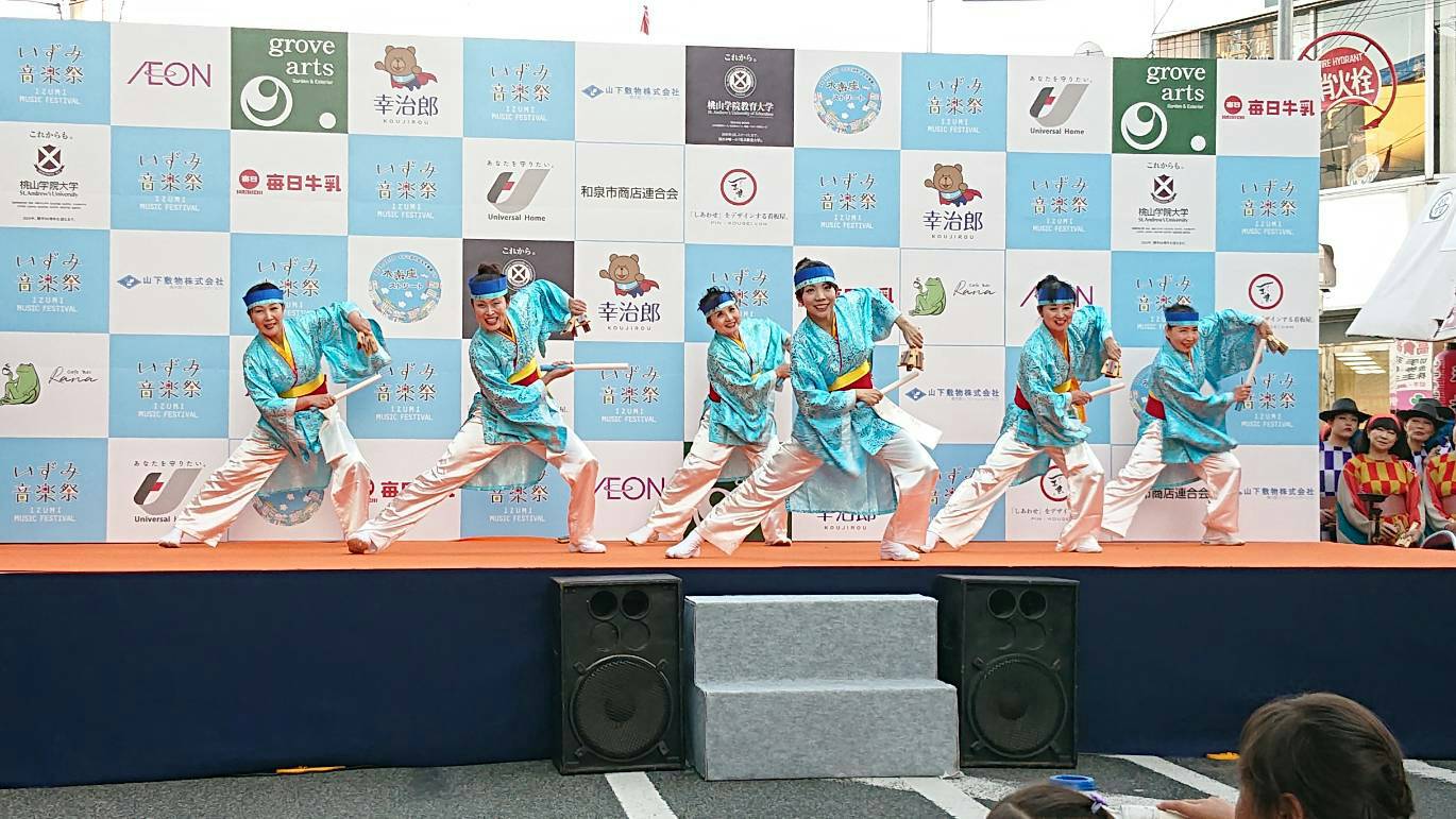 いずみ音楽祭は、和泉府中駅前の商店街の通りを車両通行止めにして開催されます。2つの舞台の間には食べ物の屋台がずらっと並び、今年もたくさんの人が行き交い賑わいました。