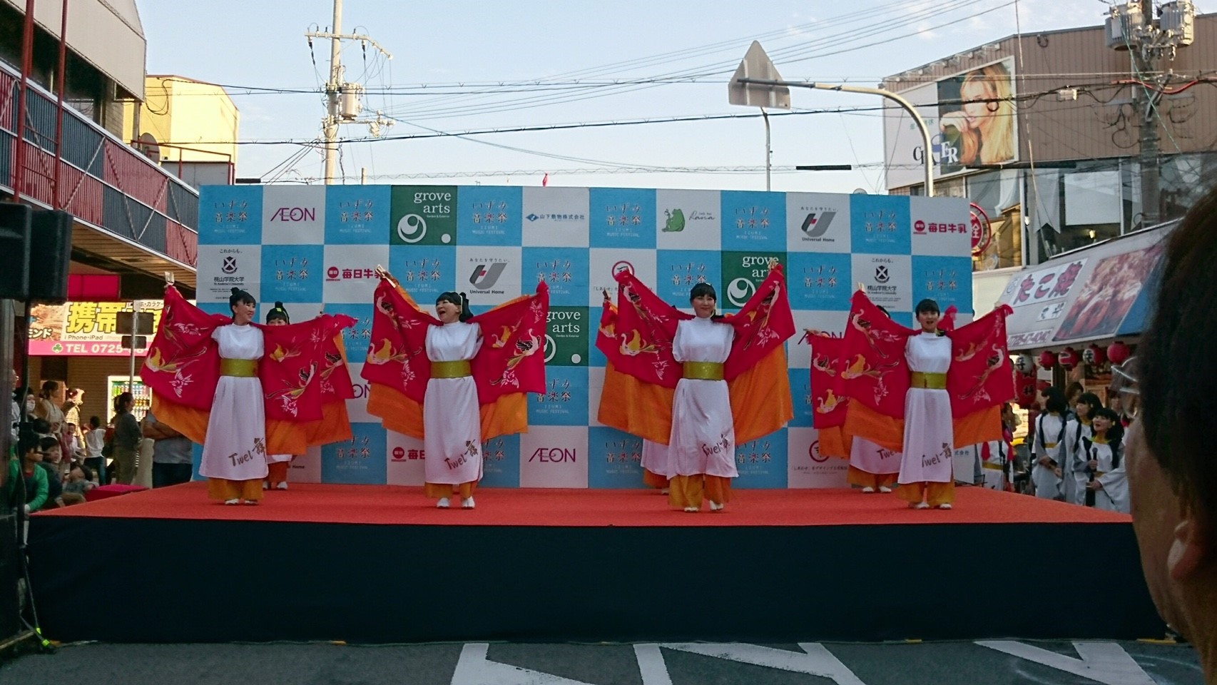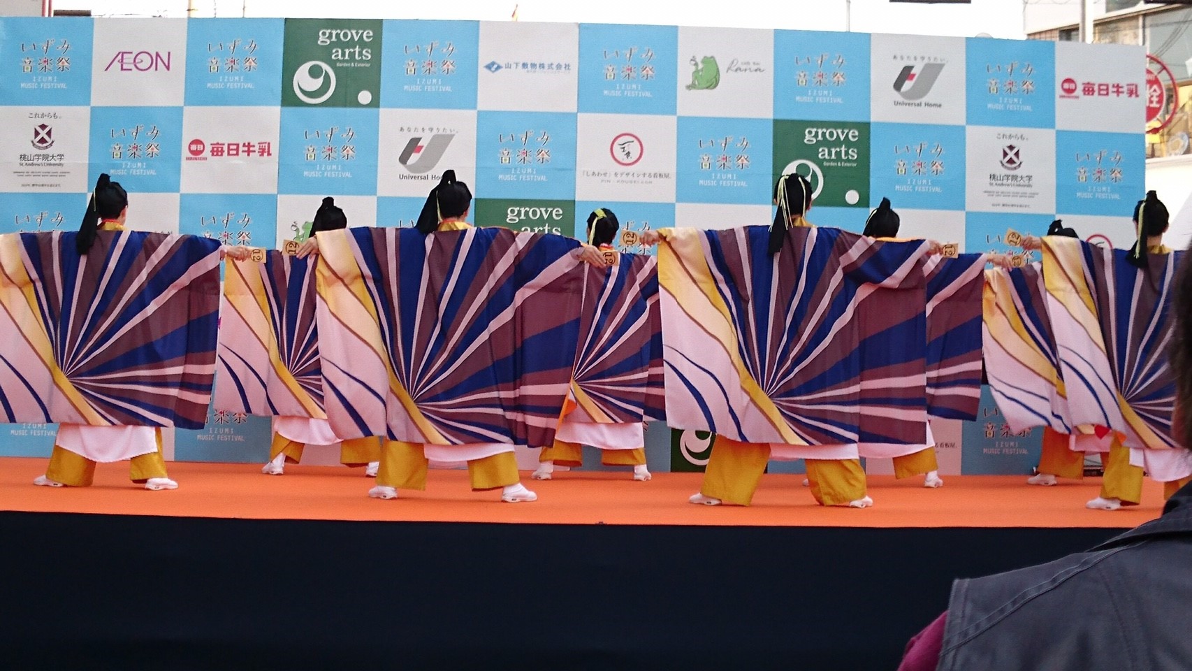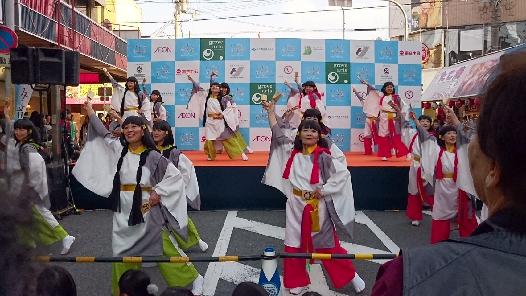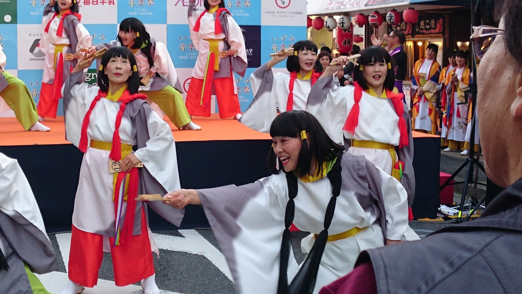 今日はステージ発表のトリを任されていました。すでに日舞や腹話術で盛り上がっているところに、華やかな衣装を身にまとった大所帯の登壇に、いったい何が始まるのかと周囲から急に人が集まってきました。