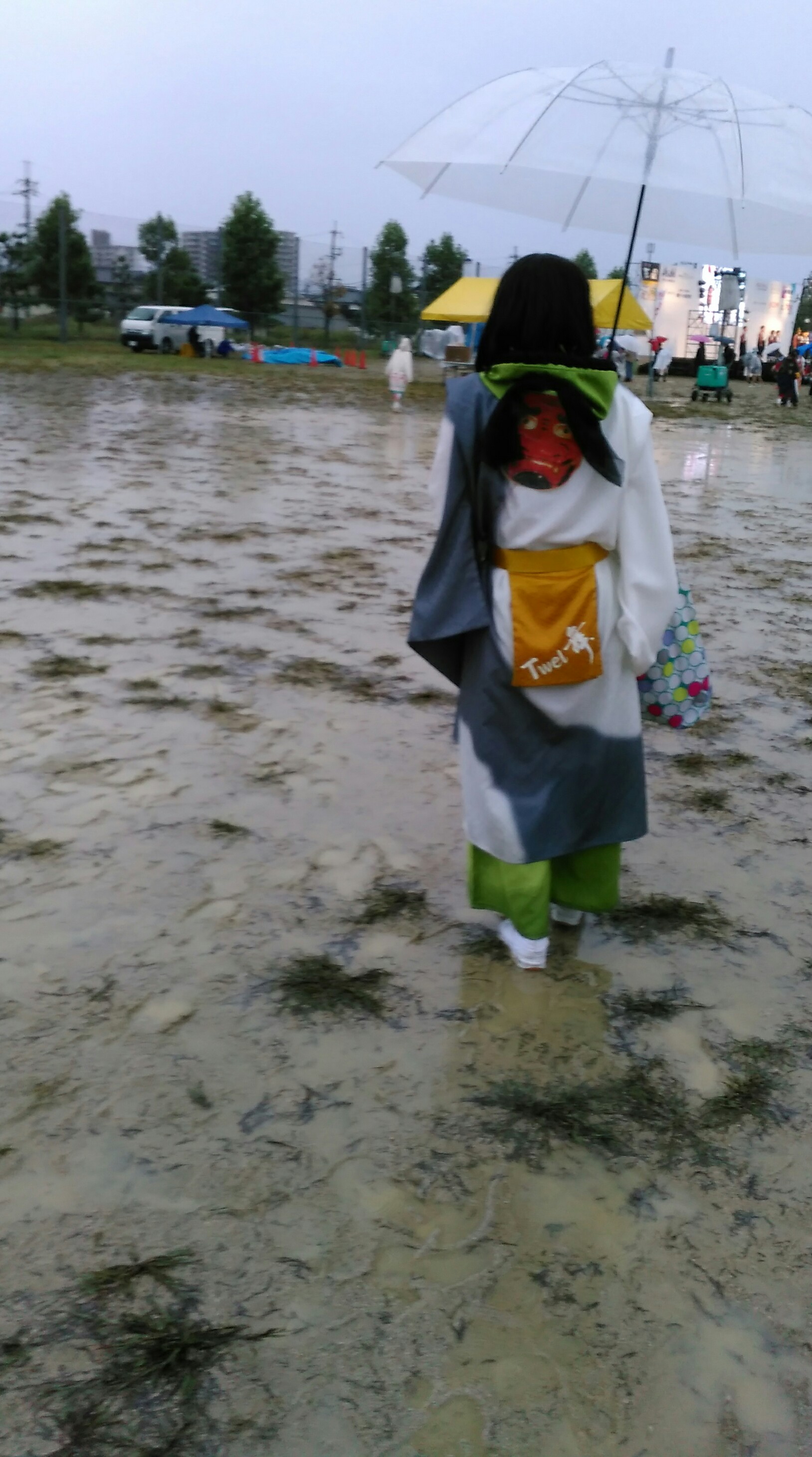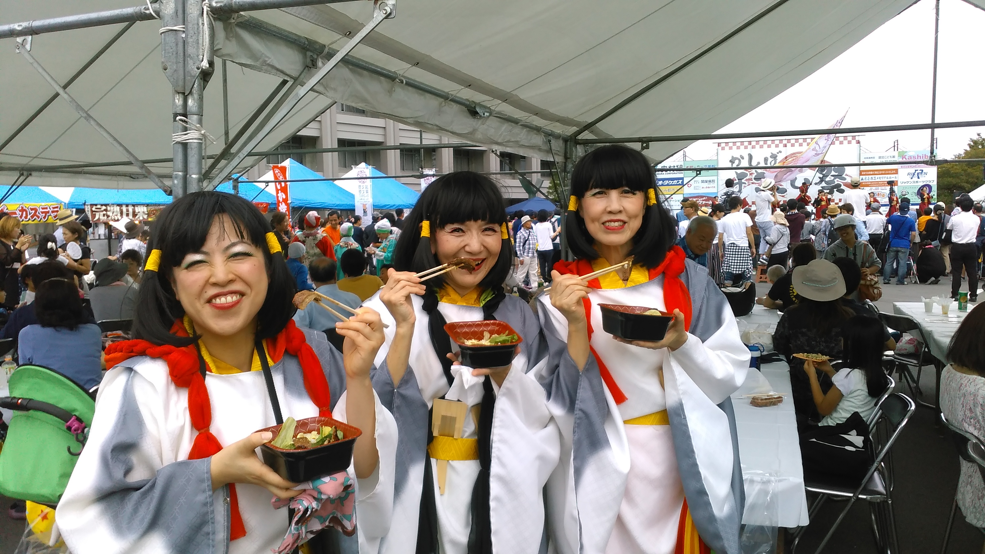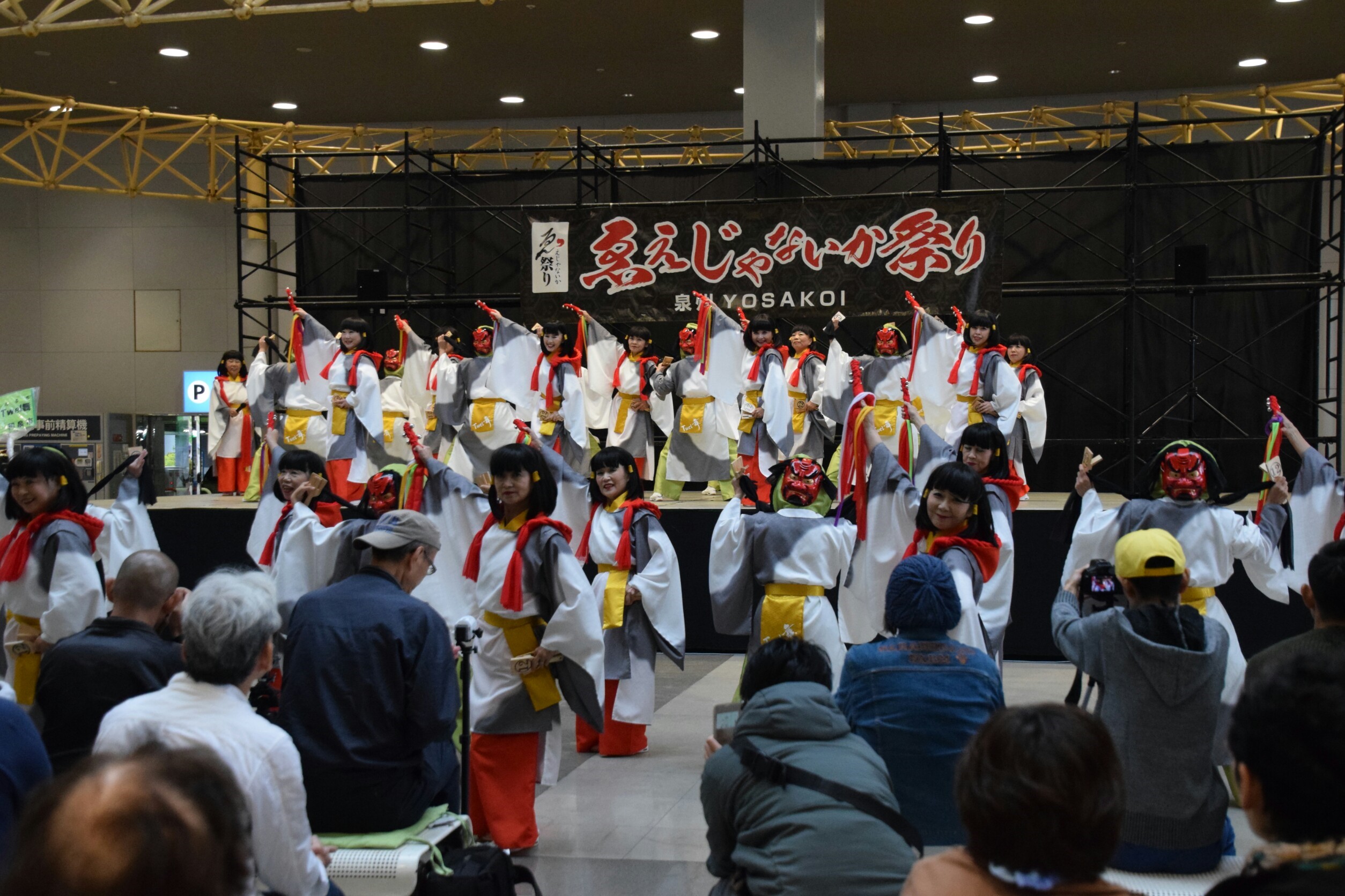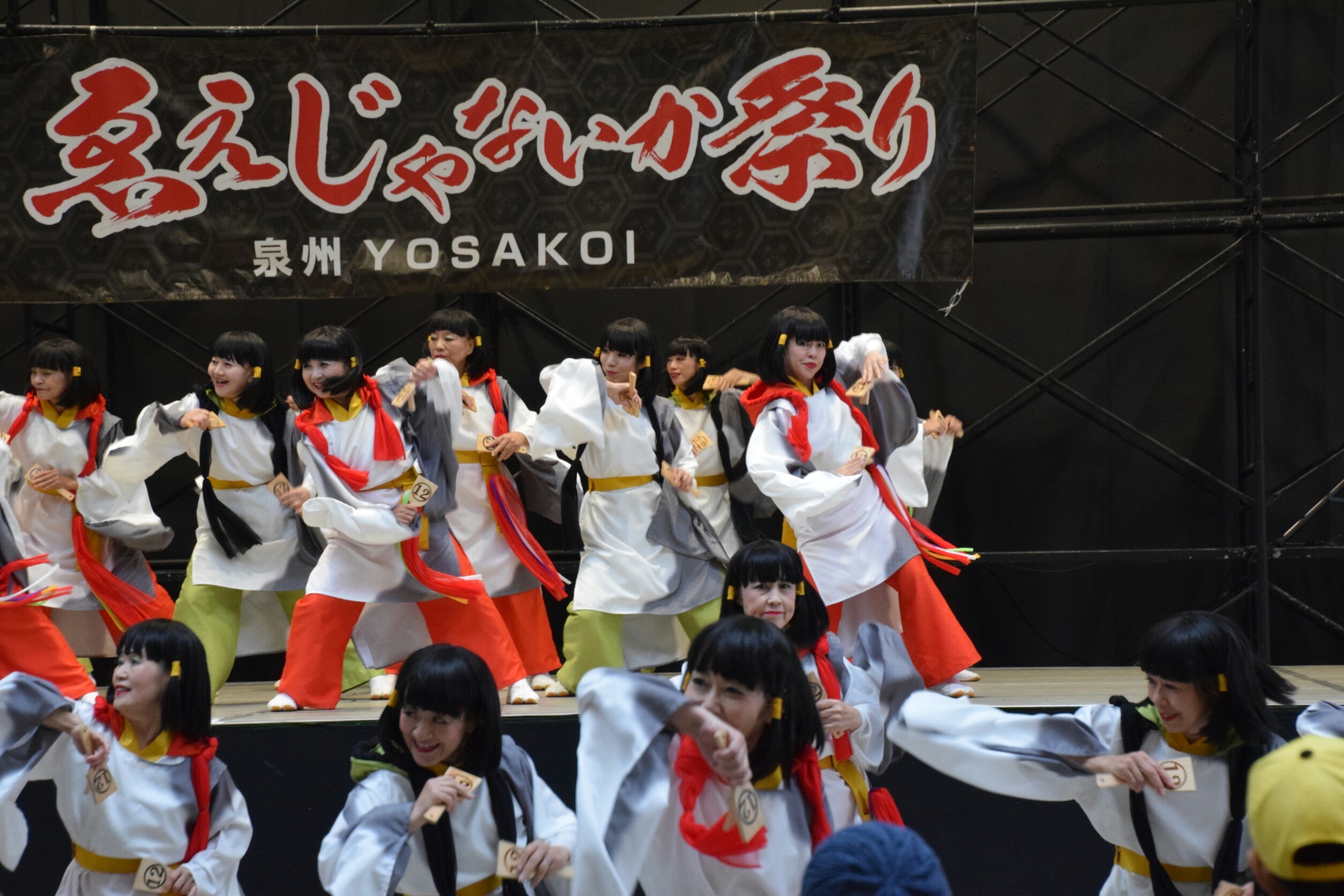 今日はステージ発表のトリを任されていました。すでに日舞や腹話術で盛り上がっているところに、華やかな衣装を身にまとった大所帯の登壇に、いったい何が始まるのかと周囲から急に人が集まってきました。
