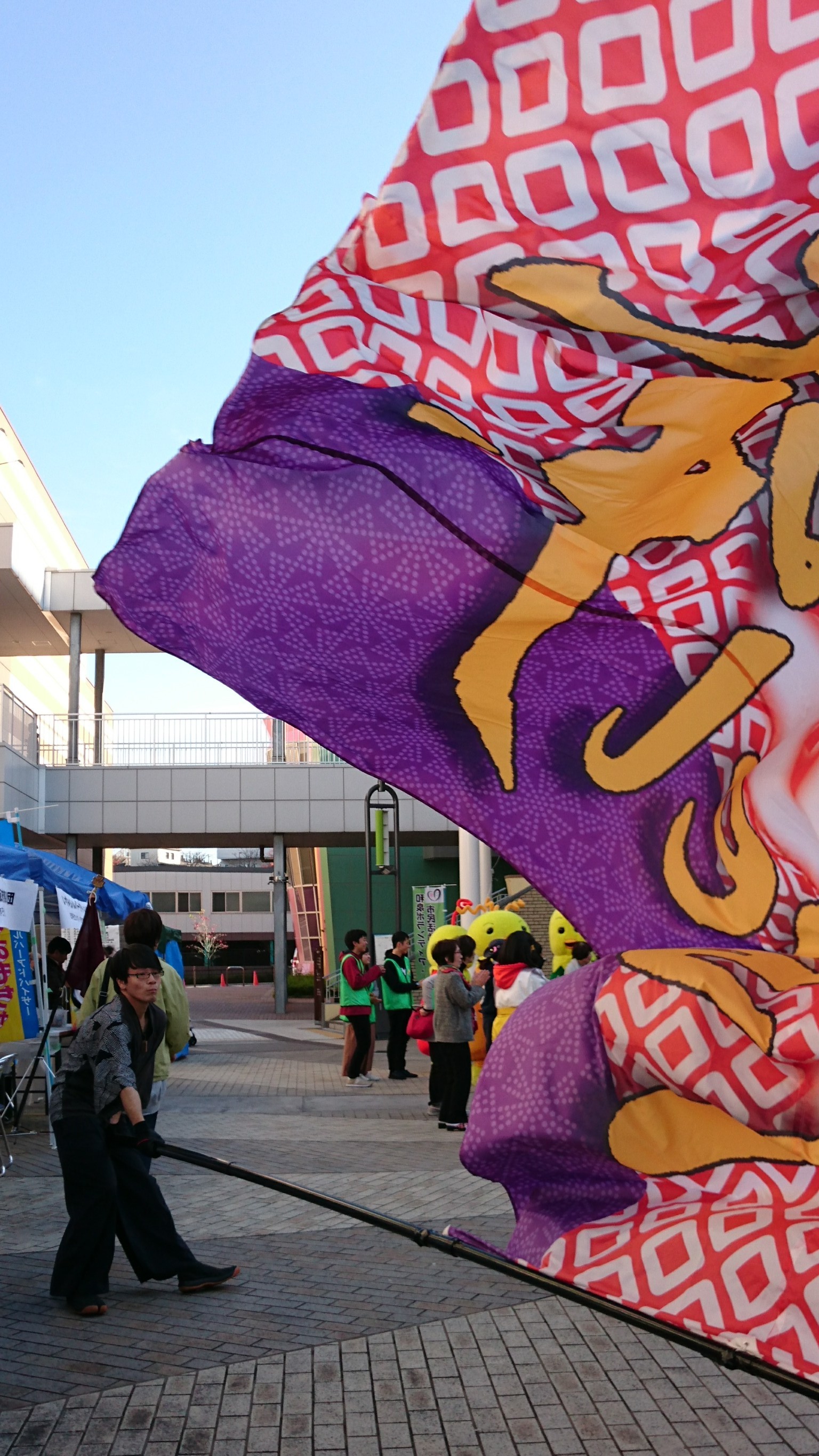 F君が踊りの輪の中で大旗を振る大サービス。皆、頭上に舞う迫力満点の旗にウワ~!と大喜びでした。