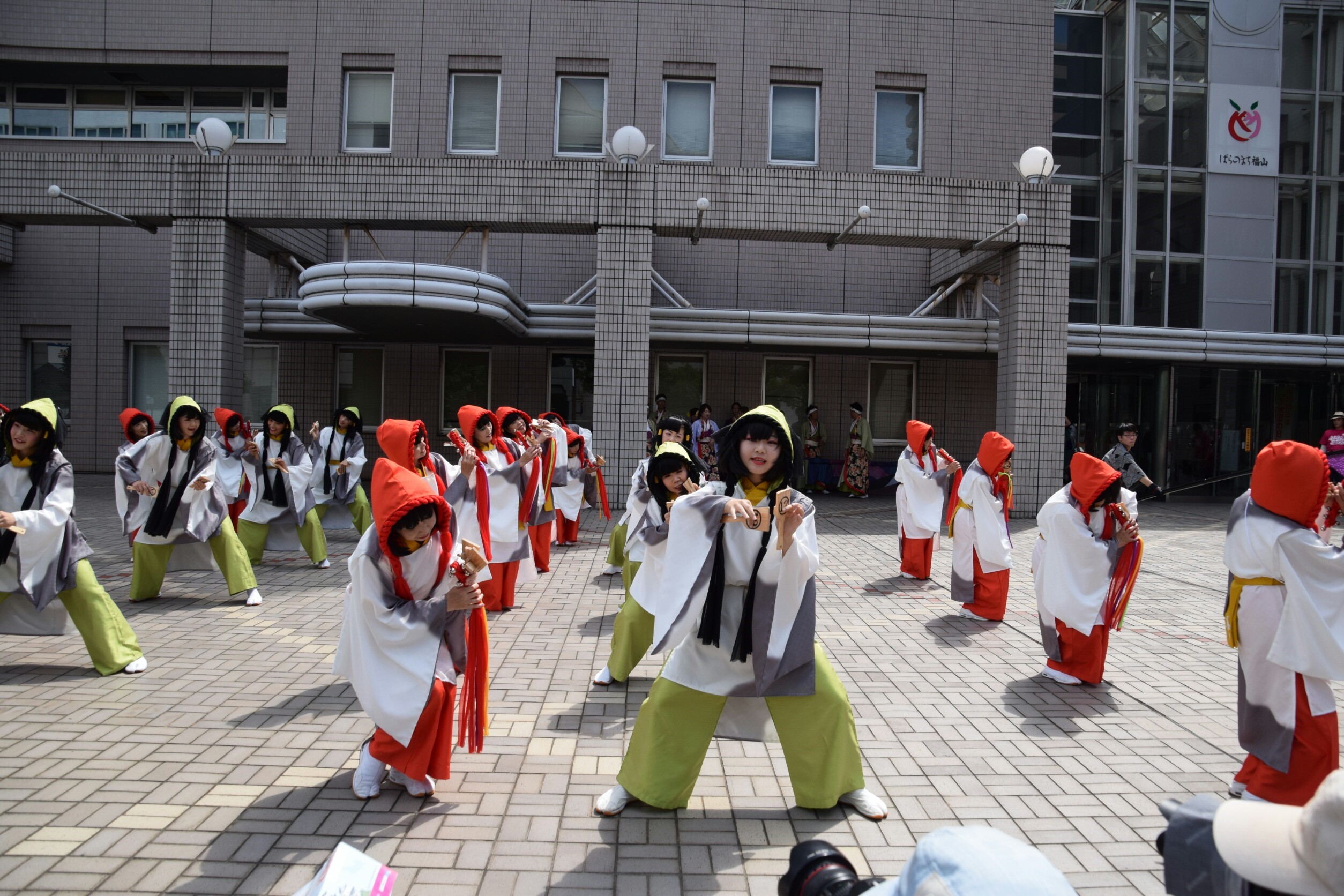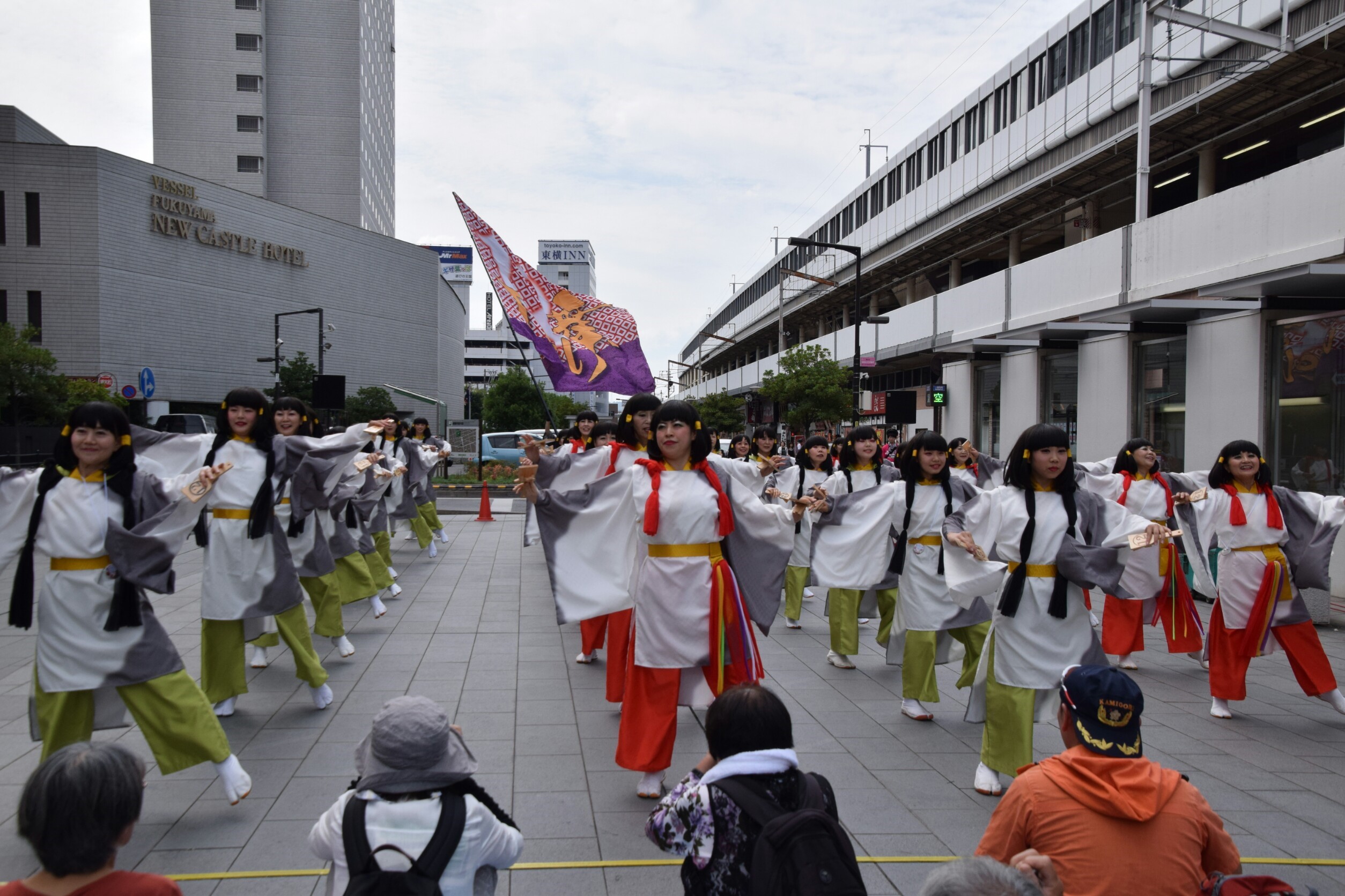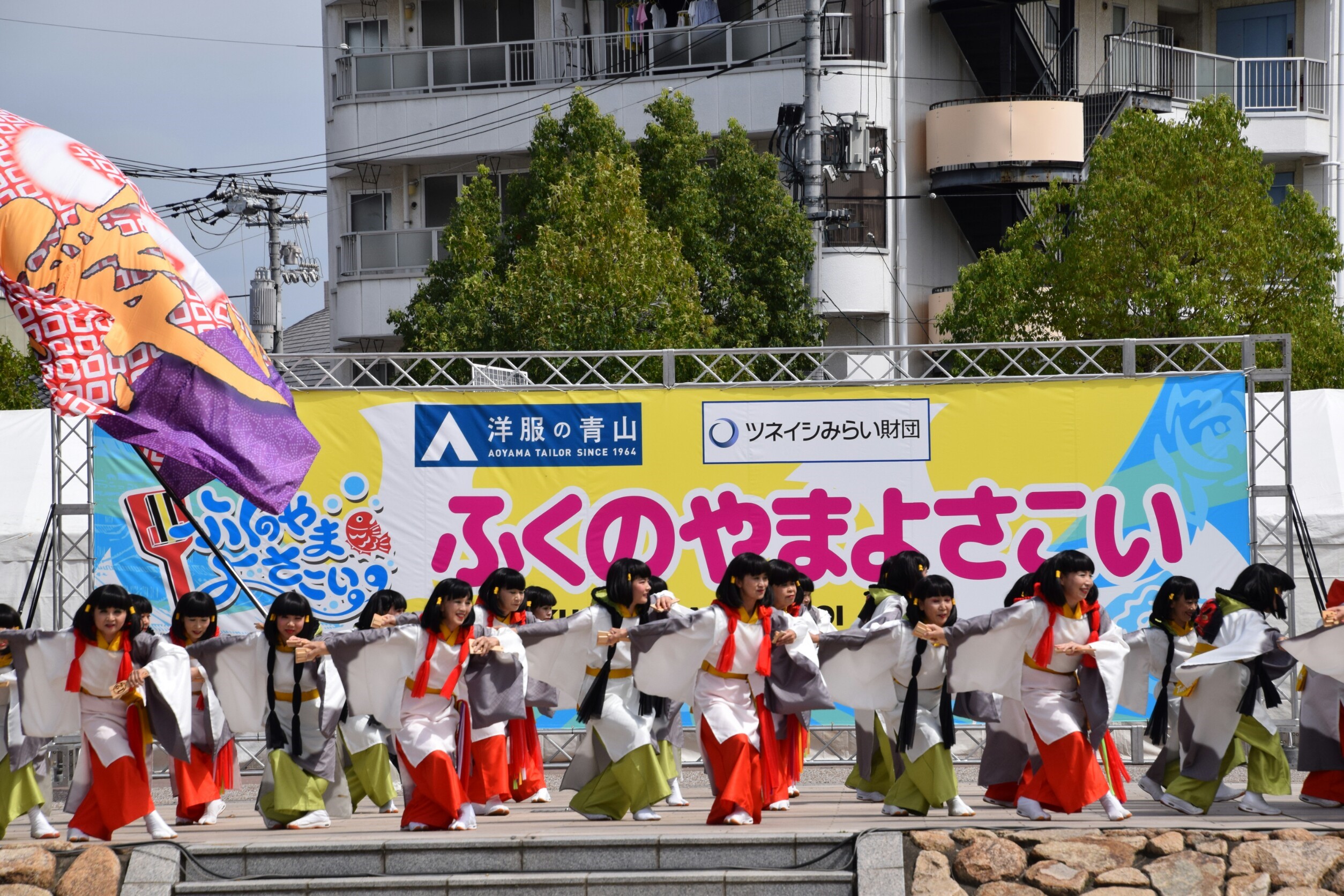 というのも、どしゃ降りの中、全身ずぶ濡れで踊った昨年のふくのやまよさこいが語り草になっていたからです。でも、そんな大雨の中でも福山の皆さんがあたたかい声援を送ってくださったことが忘れられず、今年もまた福山までやってきました。