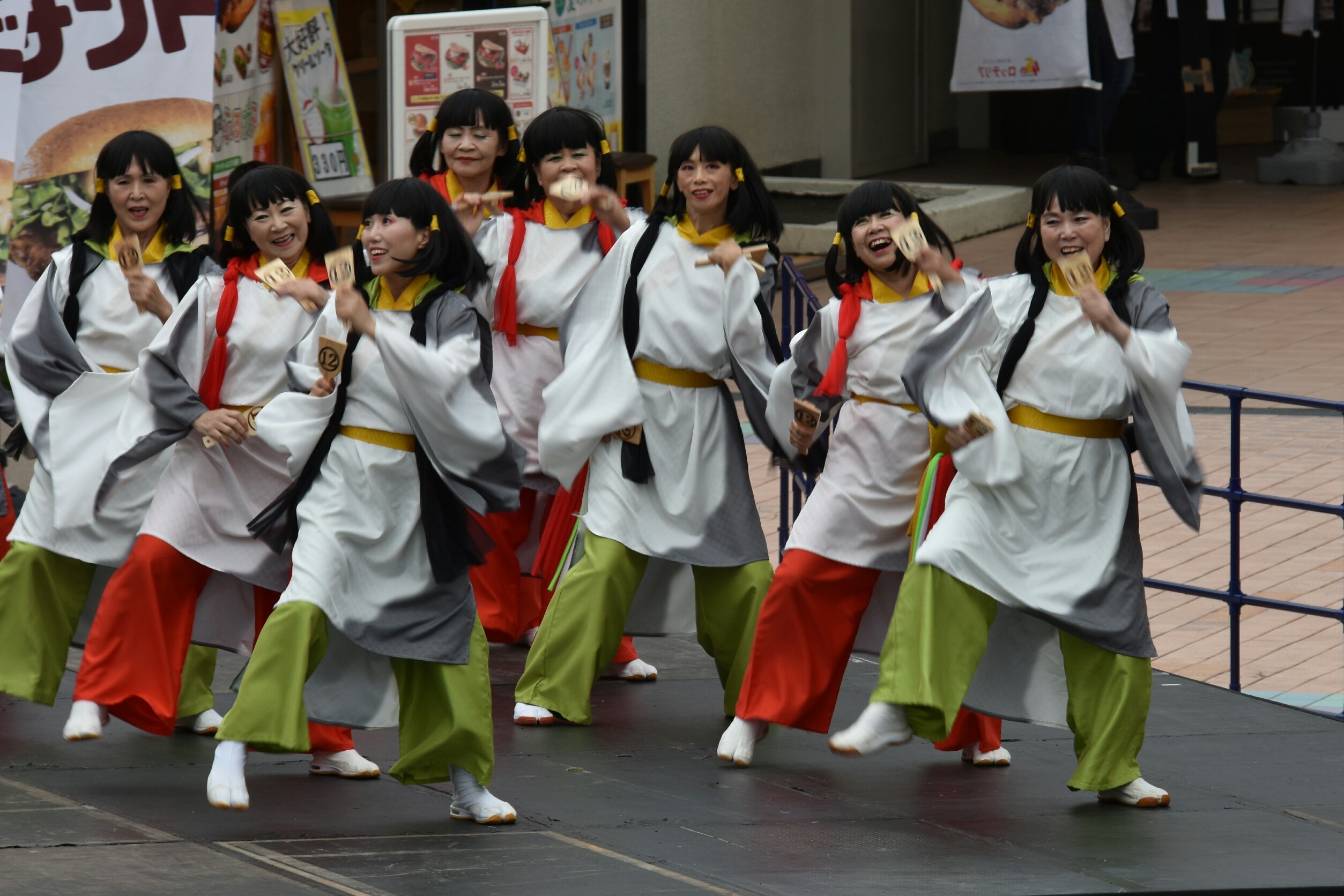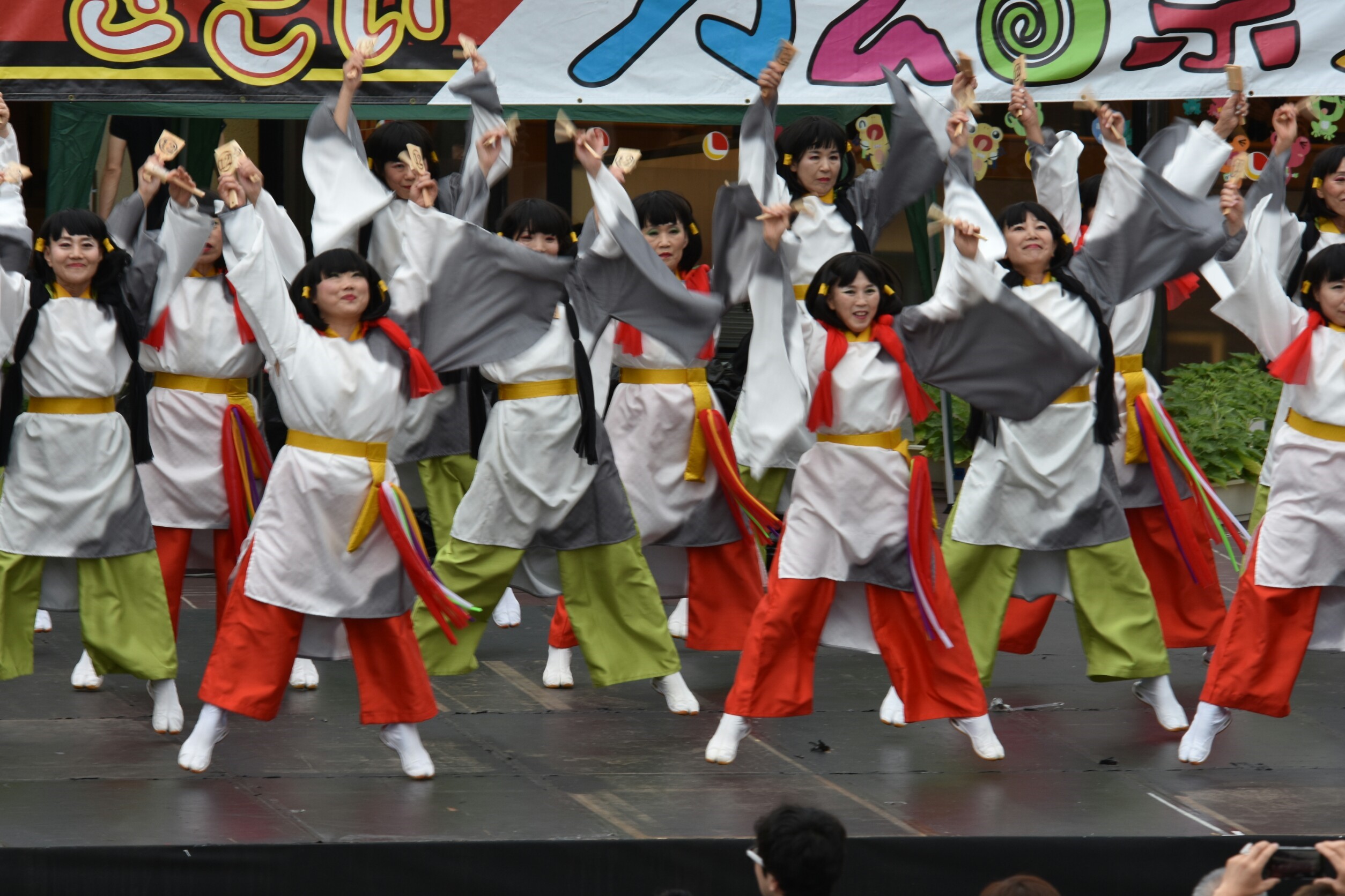 作業所の皆さんのハンドベル演奏とダンスに続き、よさこいパフォーマンスの出番でした。「和楽会」の皆さん、作業所の皆さんと一緒に「和泉の国うまれのコダイくんロマンちゃん音頭」と「正調よさこい」で鳴子の音も最高潮!最後に「天孫降臨」を披露させていただきました。