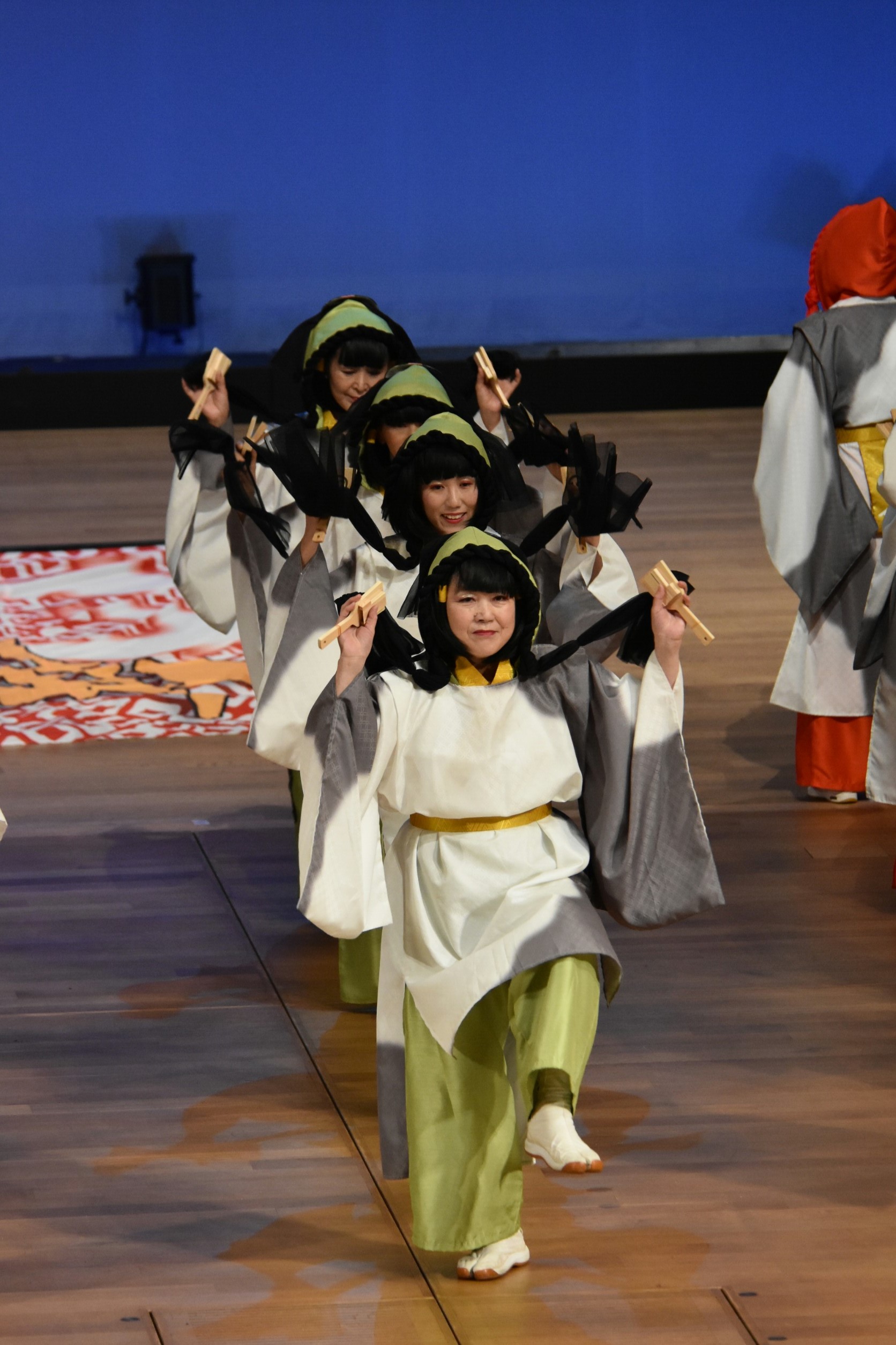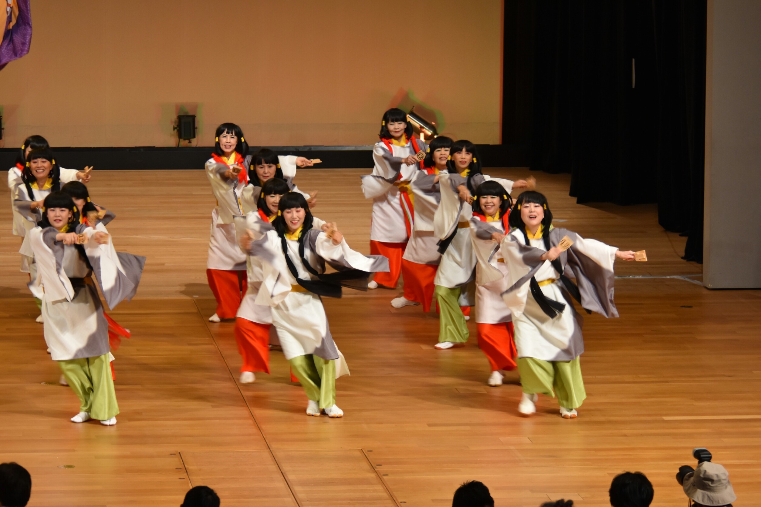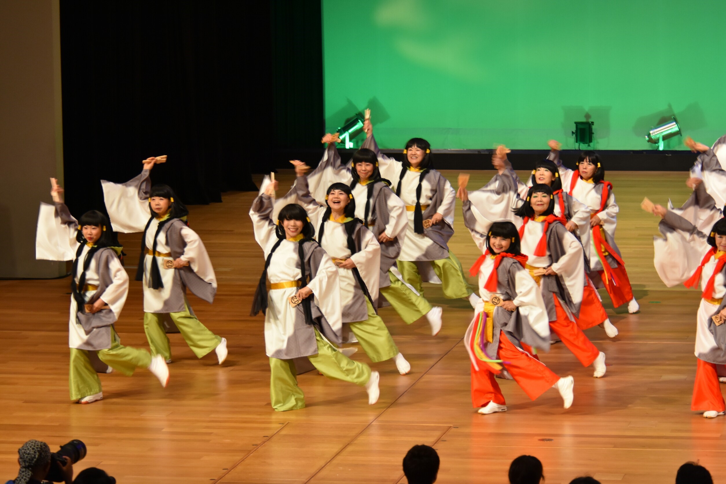 会場は利用者さんや浴衣姿の職員さんでぎっしりの中、「天孫降臨」「アマテラス」「あれそれこれ」と続くと、利用者さんから「きれいやねえ~」という声が上がり、やりがいがありました。
