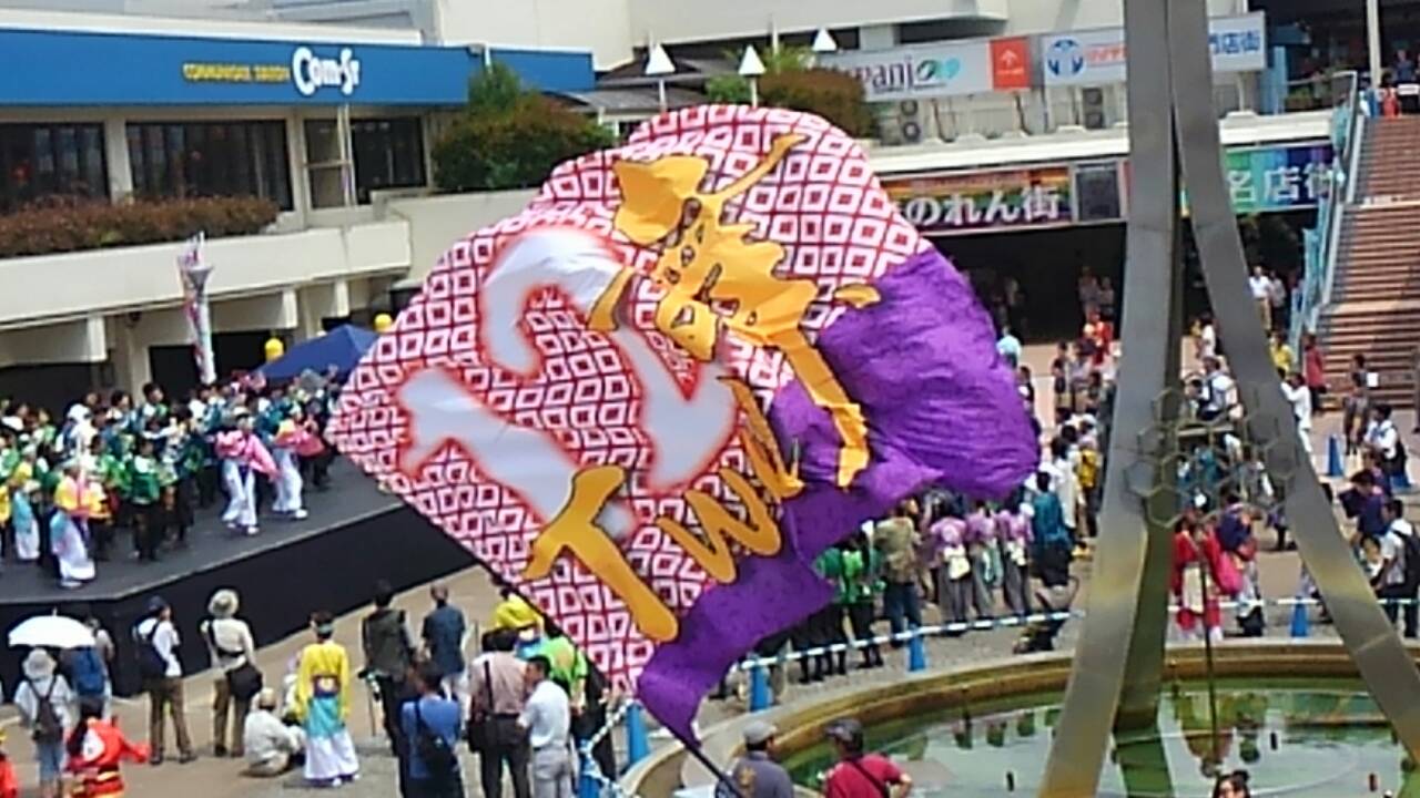 私たちのチームは、噴水広場前会場とビッグアイ会場で2回「ココロ・トリコ・イズミ」を踊りました。ビッグアイ会場では、小旗隊が踊り子の前でパフォーマンス!