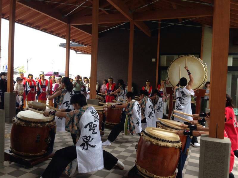 中学生のブラスバンド演奏、元気いっぱいの小学生のよさこい踊り、私たちの踊りと続き、小雨模様を吹き飛ばしたあと、市長さんらによるテープカットが行われました。迫力まんてんの和泉太鼓「鼓聖泉」の演舞も見事でした。