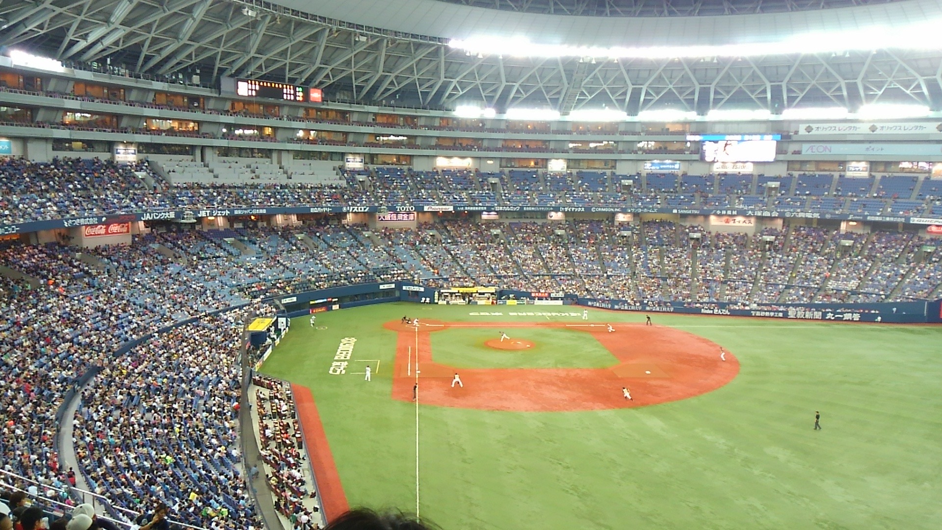 京セラドームでプロ野球公式戦 オリックス VS 日本ハム戦を観戦した後、マウンドとホームプレート間をステージに、近畿各地のよさこい10チームが演舞するイベントがあり、私たちも参加しました。
