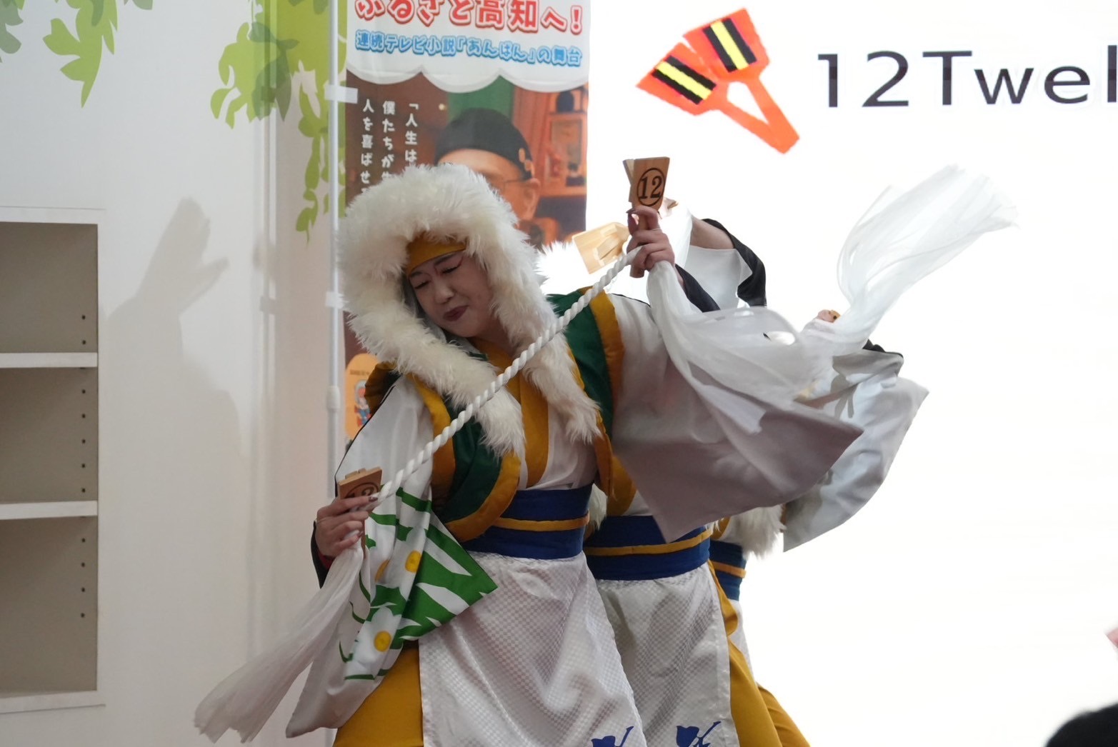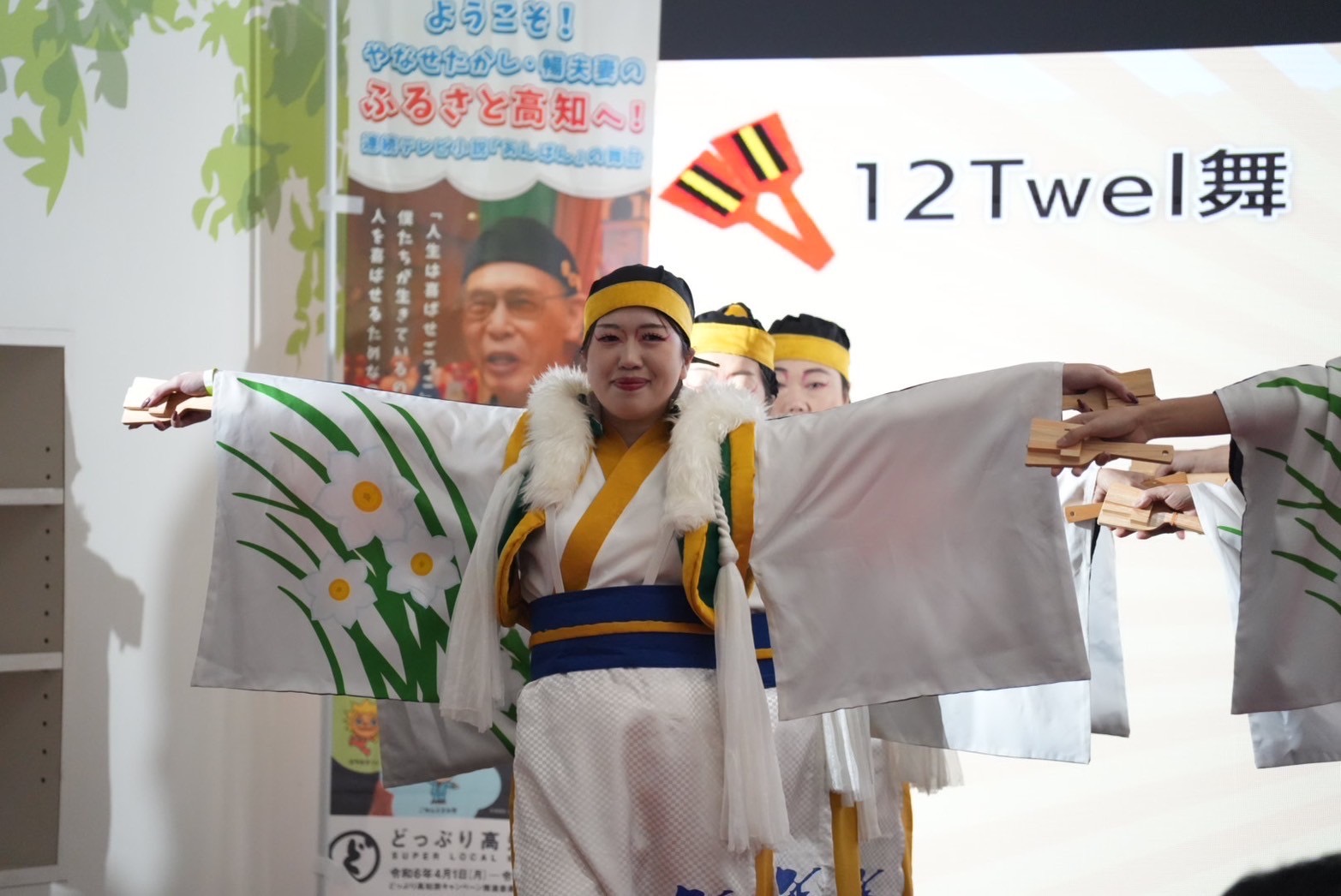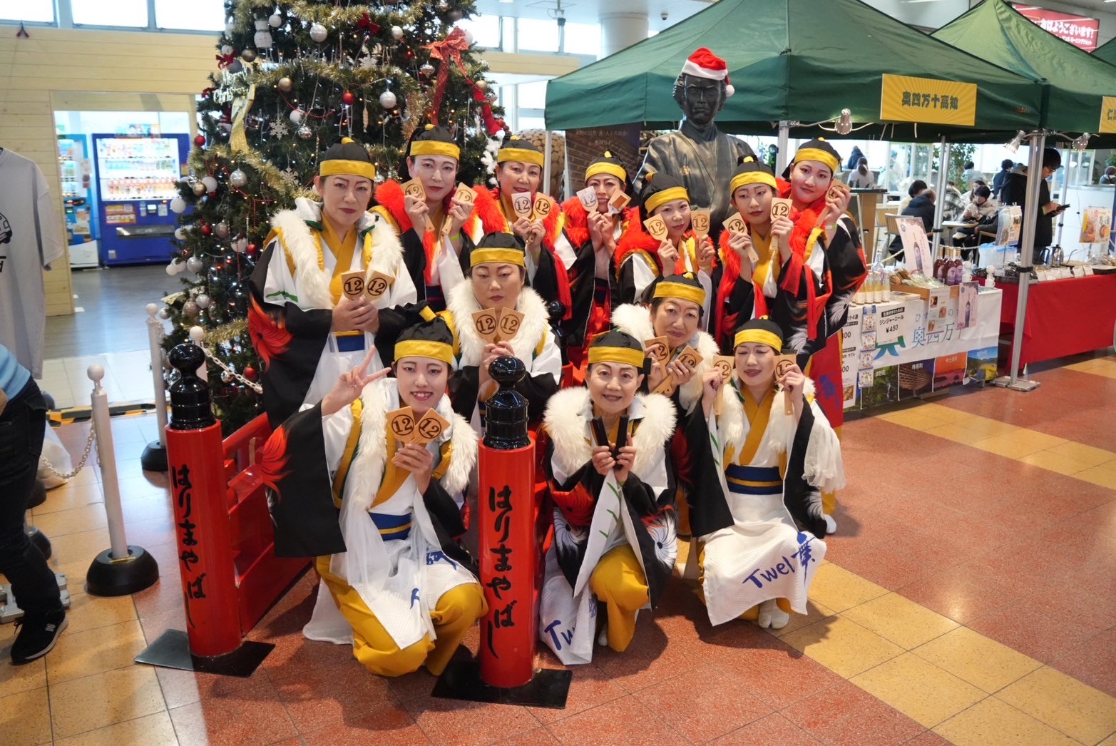 よさこい演舞以外にも、高知県物産展や鳴子絵付けなどの体験ブースがあり、大阪モノレールの土佐酒列車「高知よさこい号」も運行されていました。龍馬さんもクリスマスの装いでした。